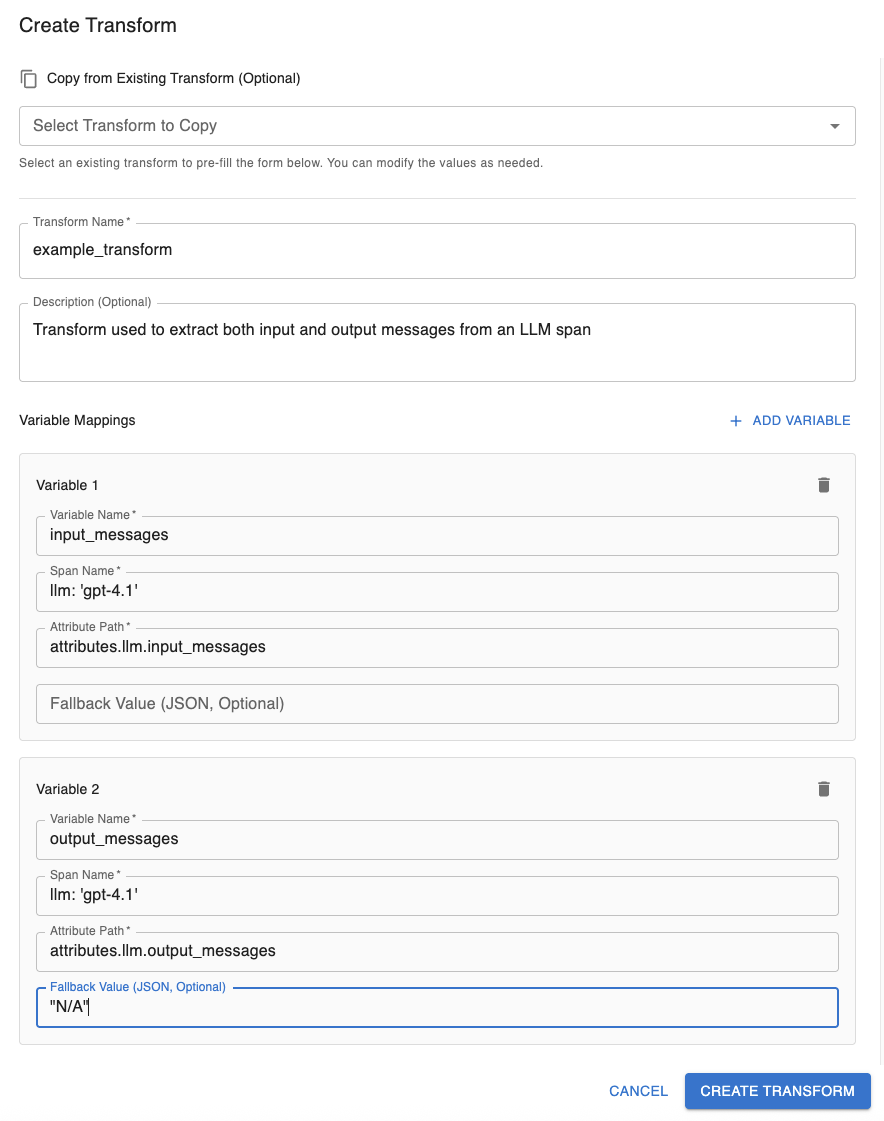 A fallback value is a value you can assign so if a trace doesnβt match the transform exactly, it will still execute properly. For example, if you had an llm agent βgpt-4.1β that failed to generate an output, the system may have sent a trace that contains input messages but no output messages. If we had a fallback value for our variable for output messages set to βN/Aβ, instead of failing to extract the variables we now just see that it wasnβt present in the trace.