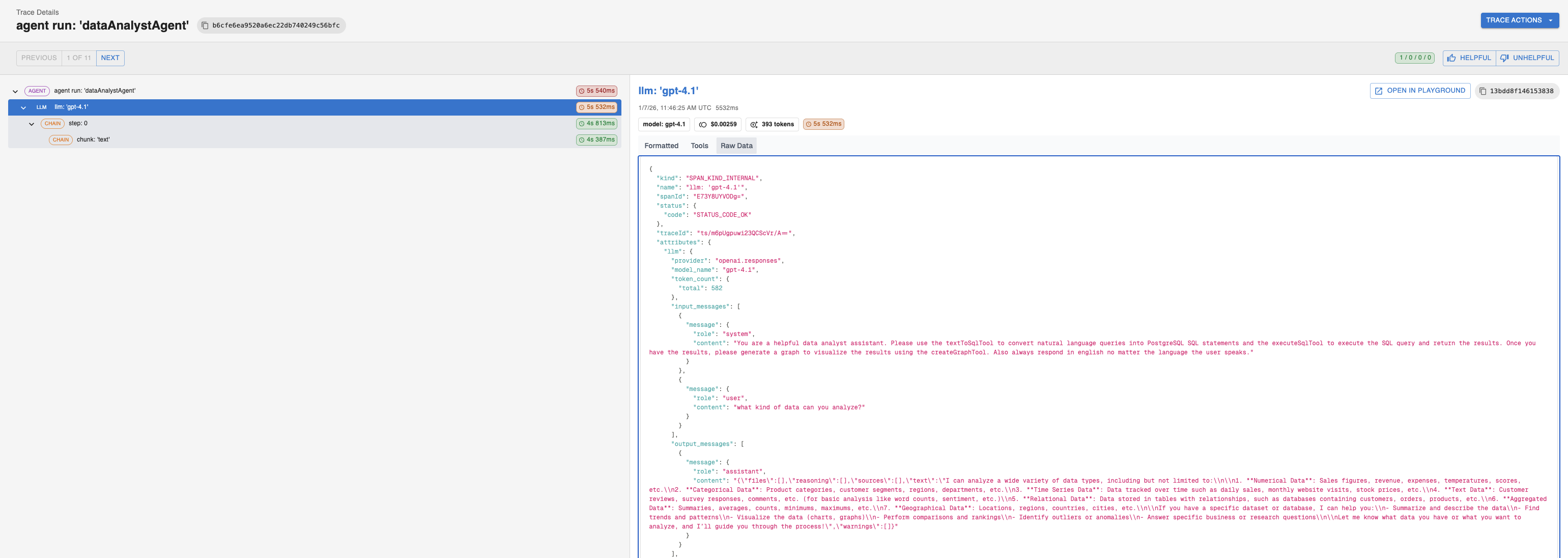 To do this we will be using a span with the name llm: 'gpt-4.1' and the attribute paths attributes.llm.input_messages and attributes.llm.output_messages which correspond to the input and output messages, respectively. We will also set a fallback value for output messages, βN/Aβ, in case our agent failed to generate a response but a trace was still sent.