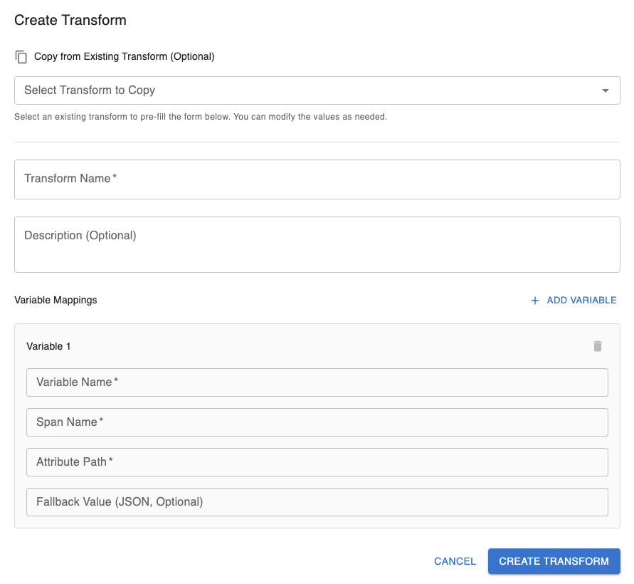 Given our span names and attribute paths this is how we would fill in the Create Transform Modal: