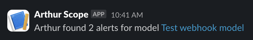 "text":"Arthur found {{alerts|length}} alerts for model <https://<ARTHUR_URL>/models/{{model.id}}/alerts|{{model.name}}>"
