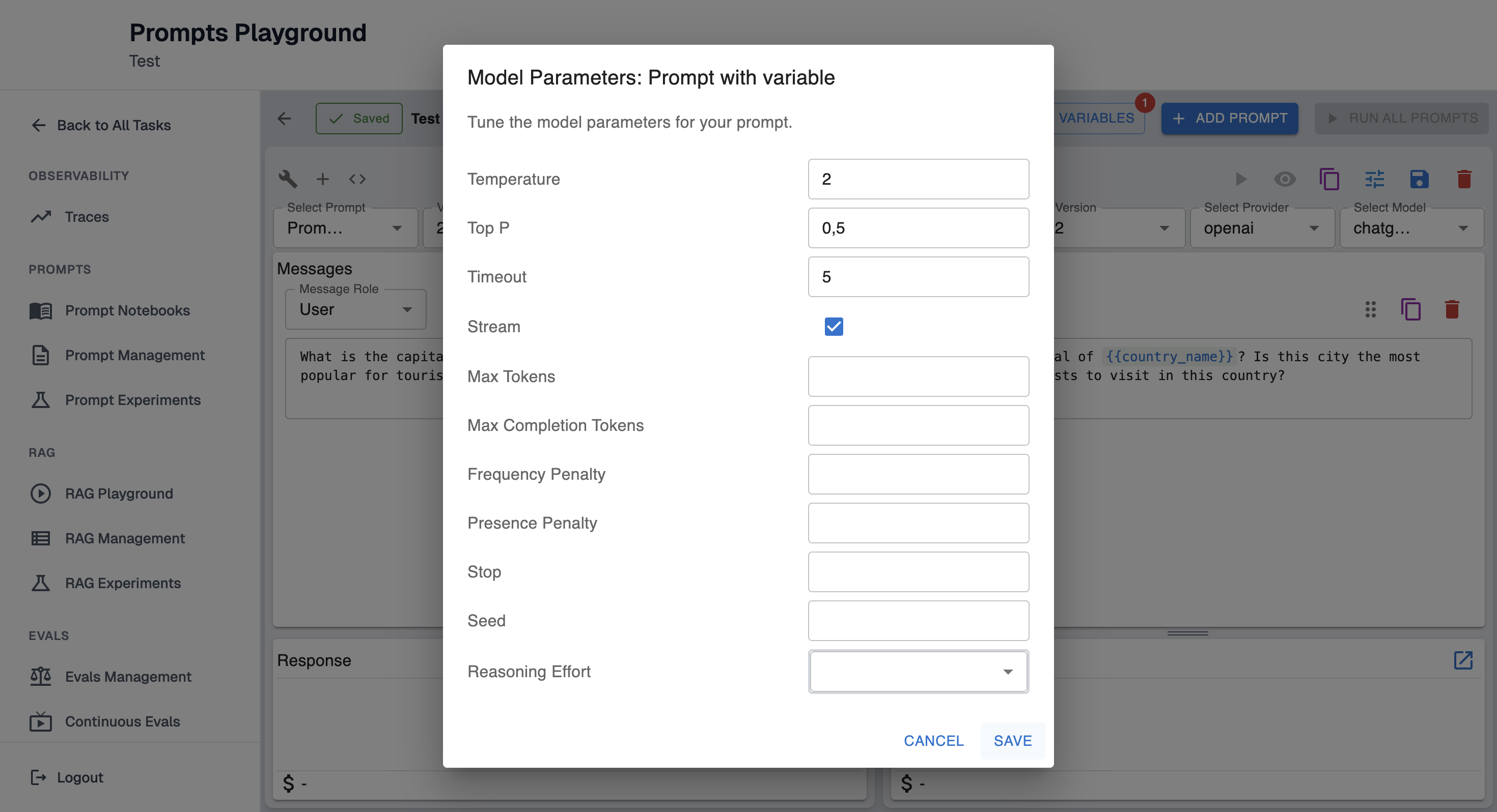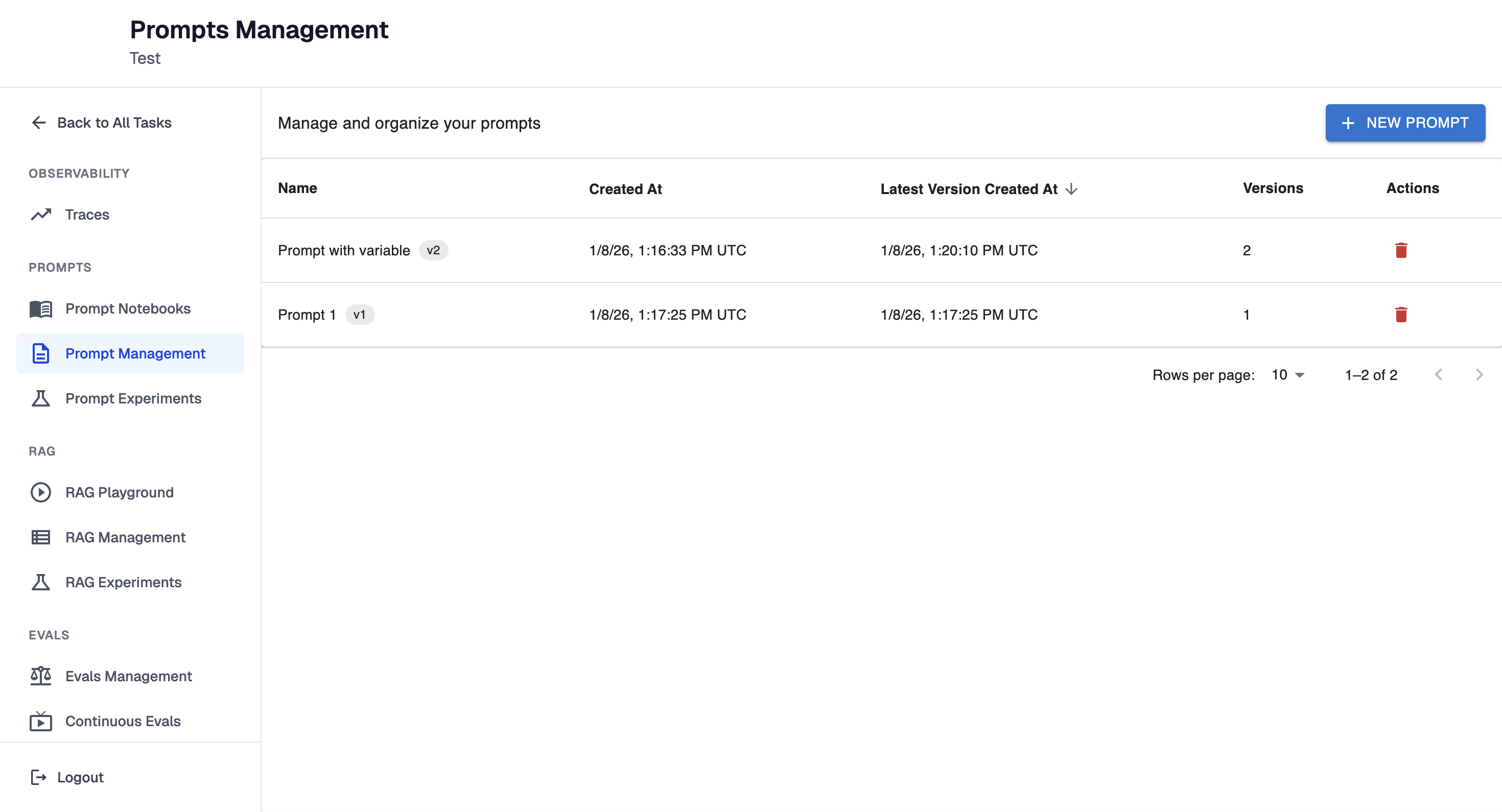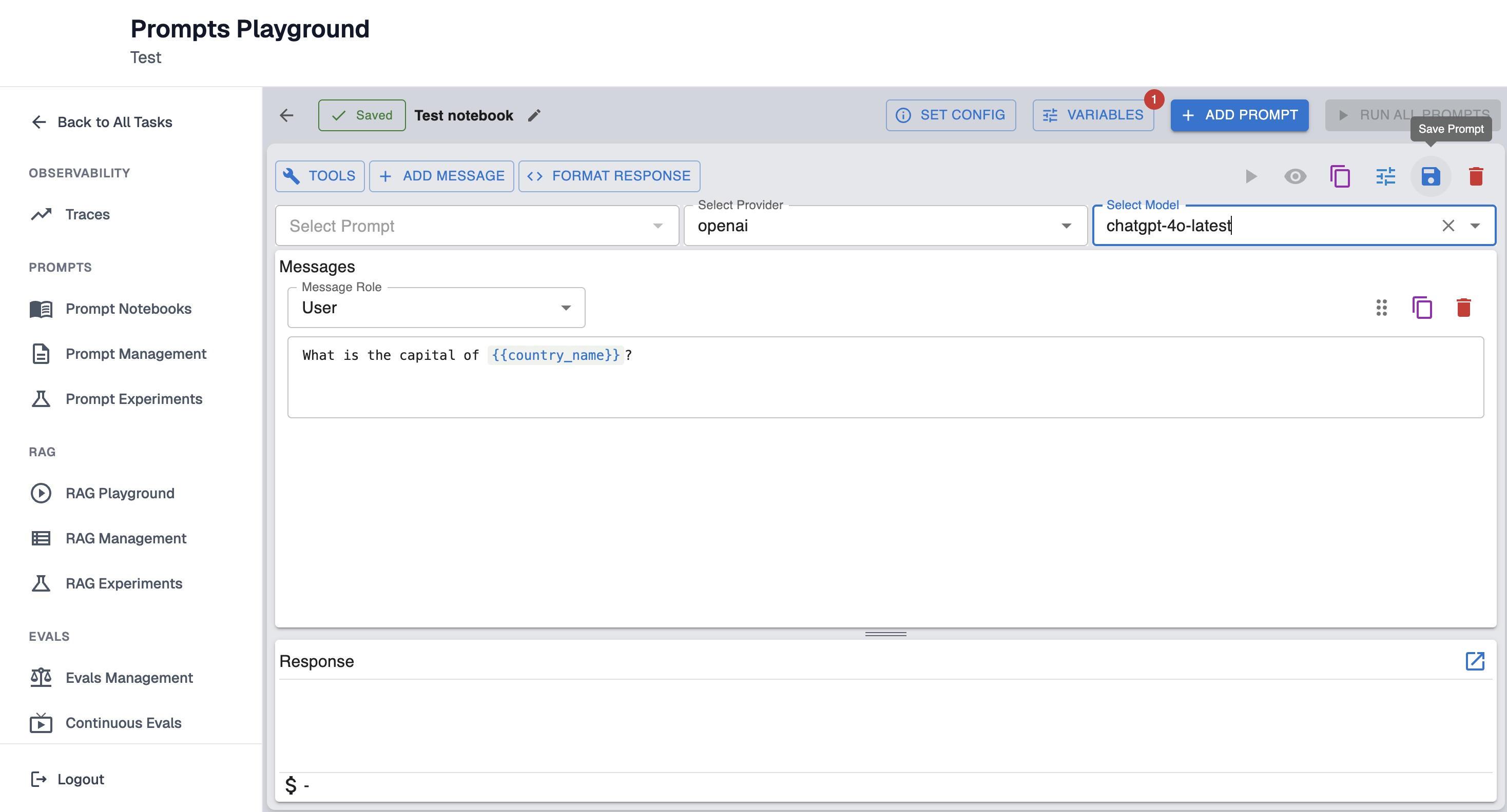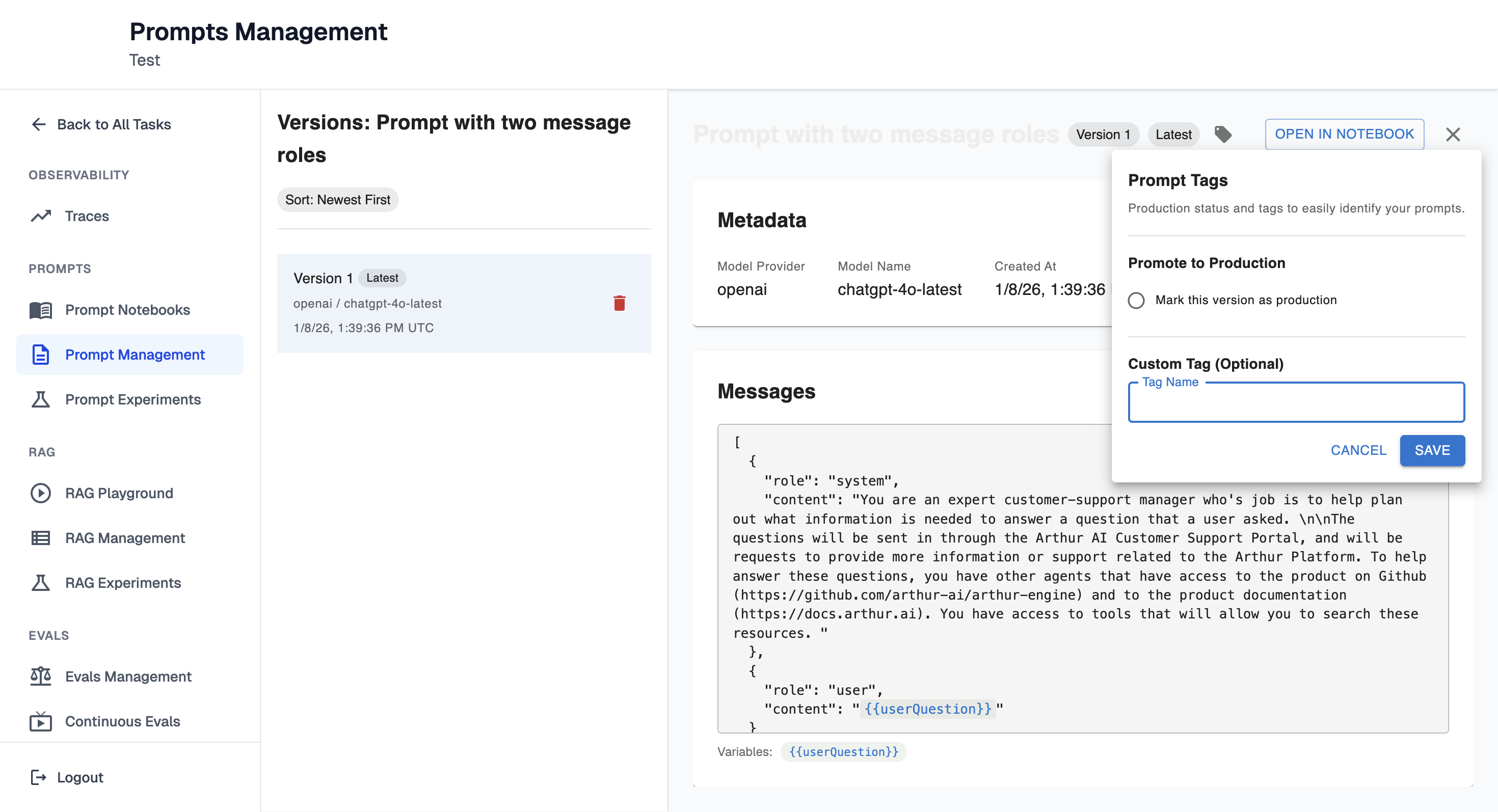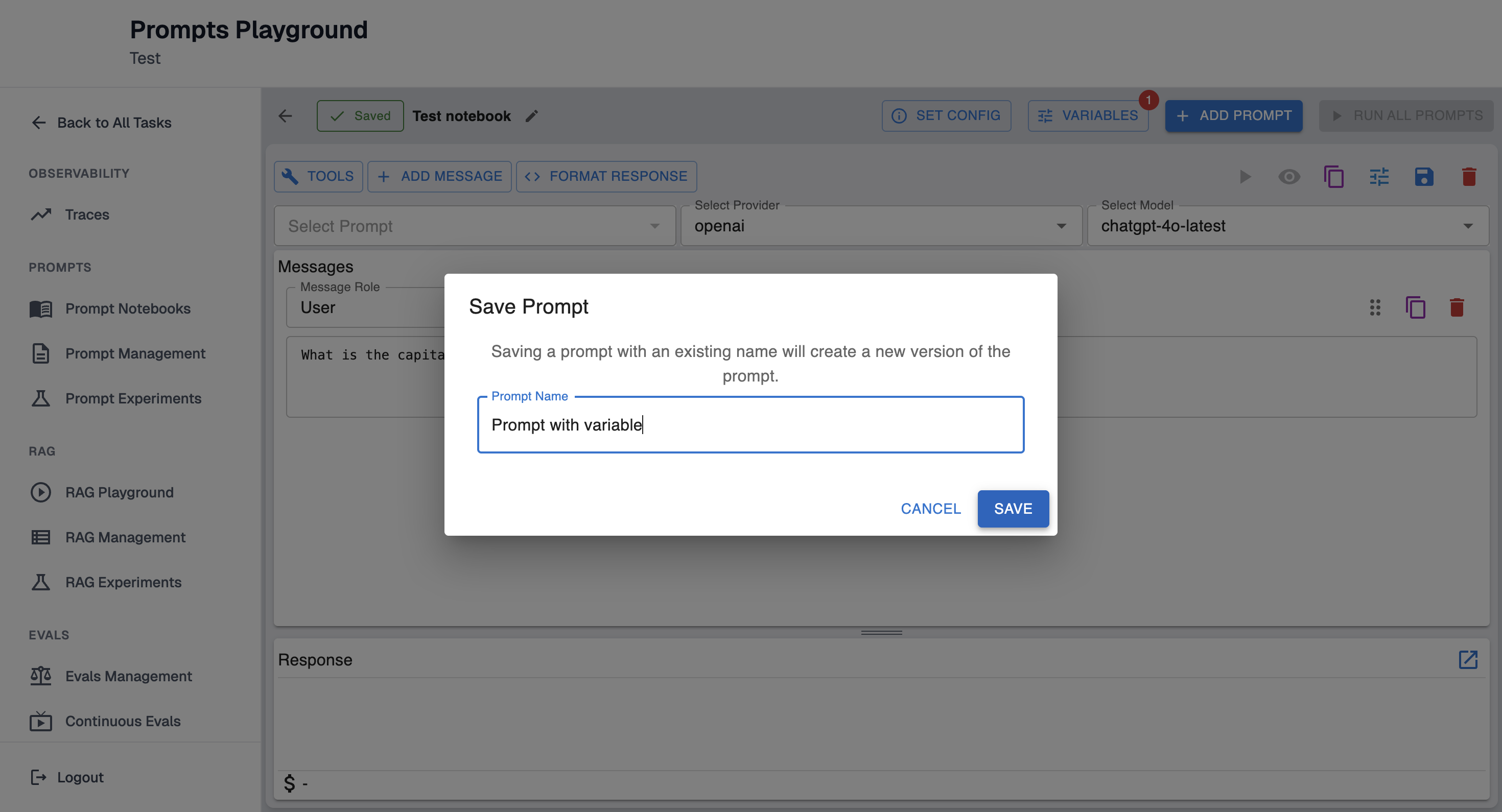 Note: Saving a prompt with an existing name will create a new version of the prompt.