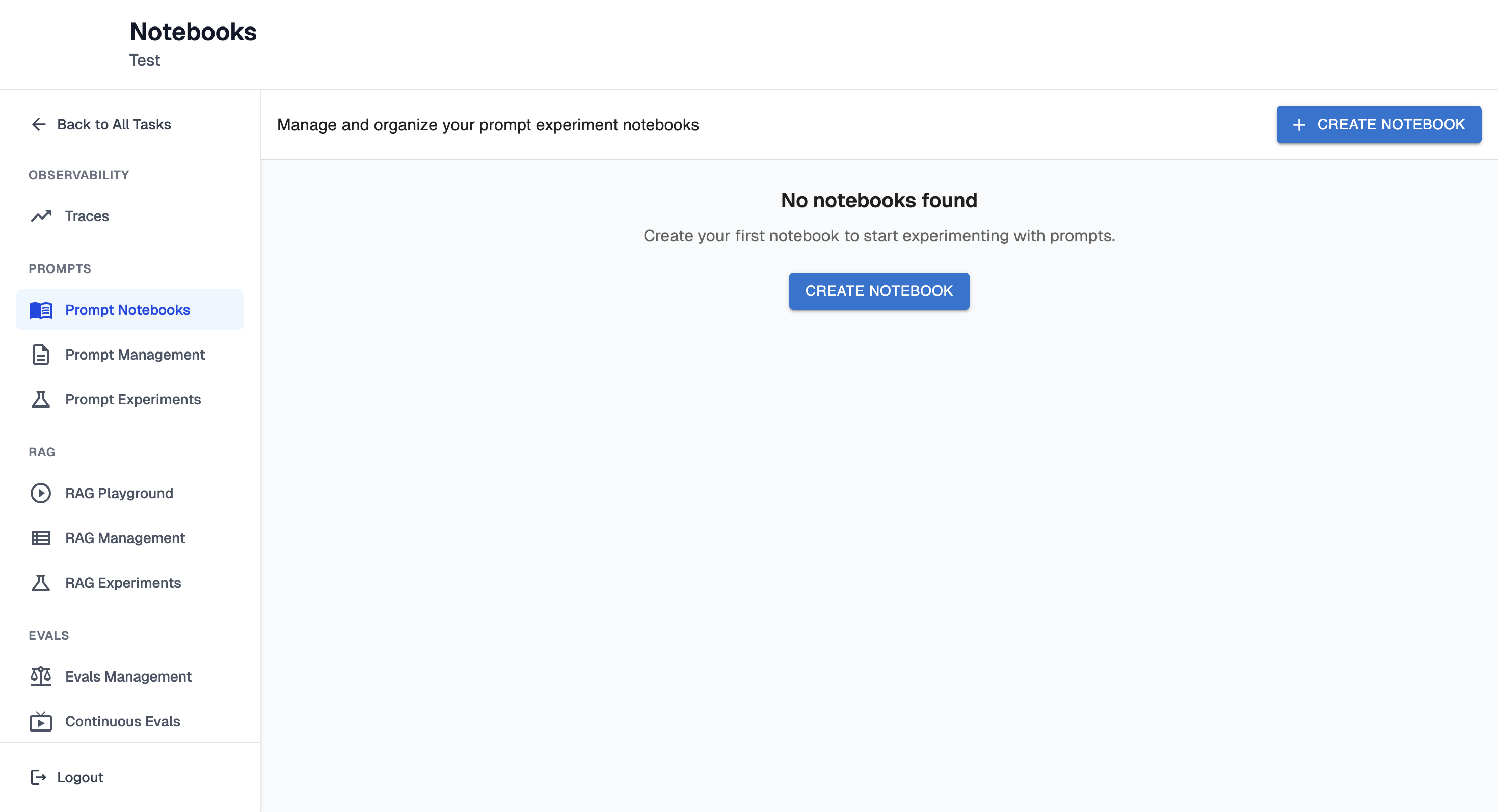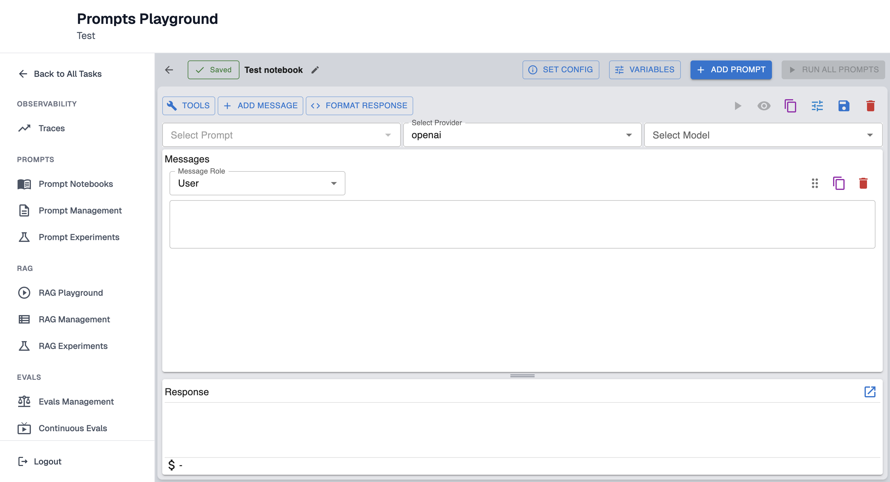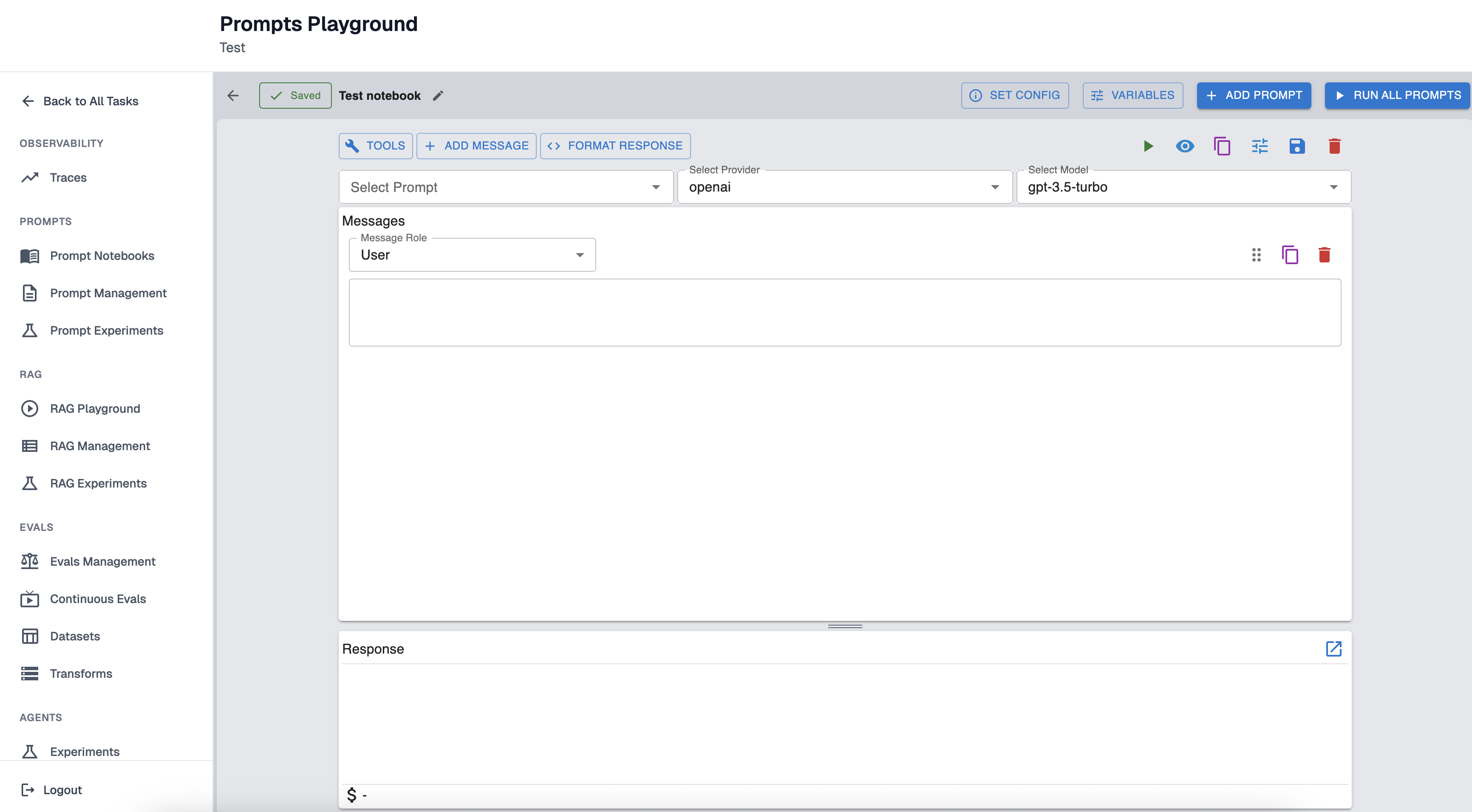 After creating new Notebook you will be redirected to Prompt Playground page where prompts can be created.