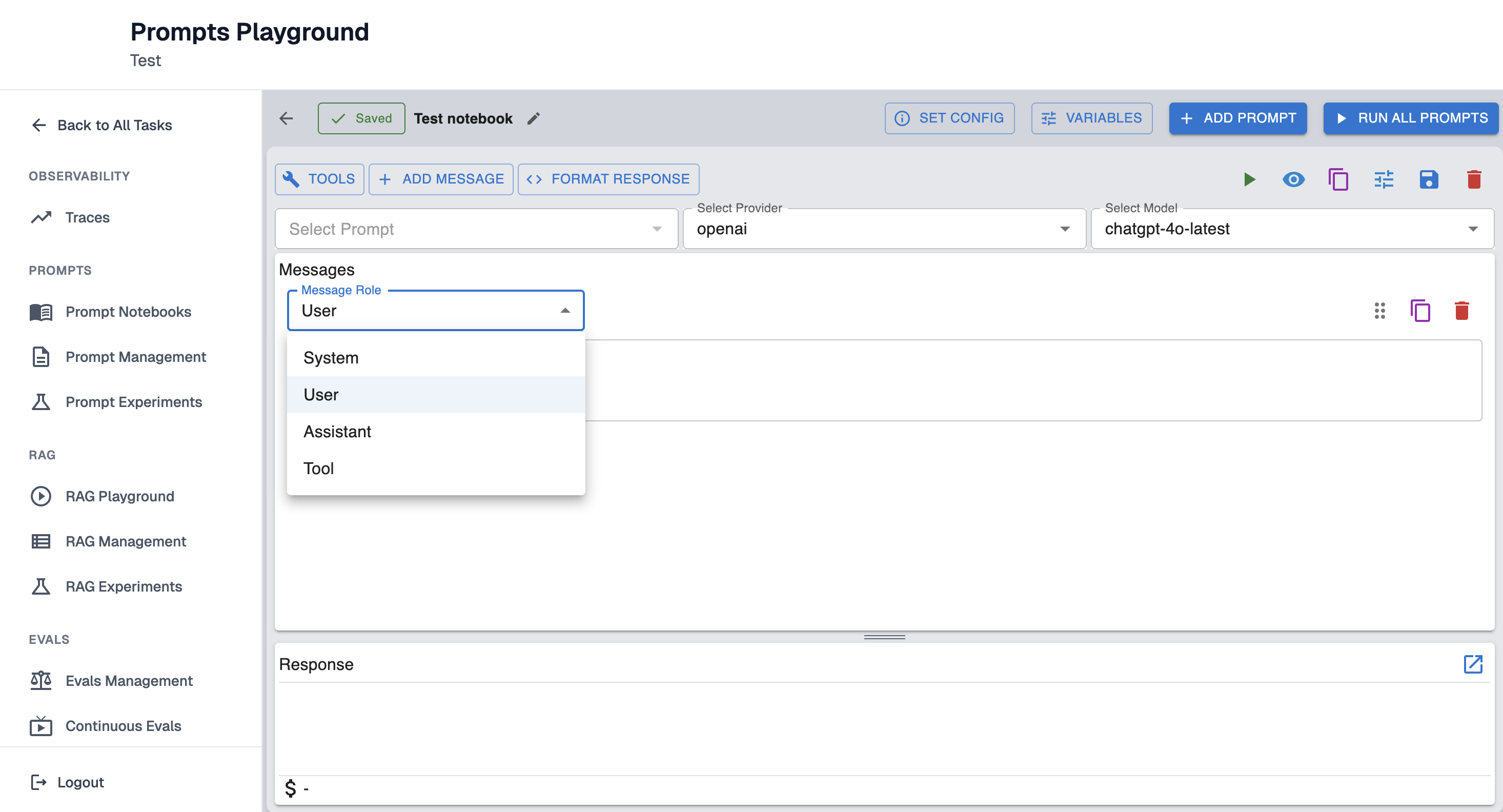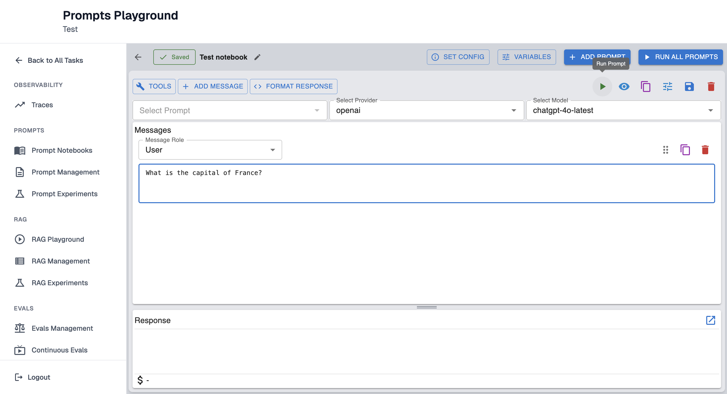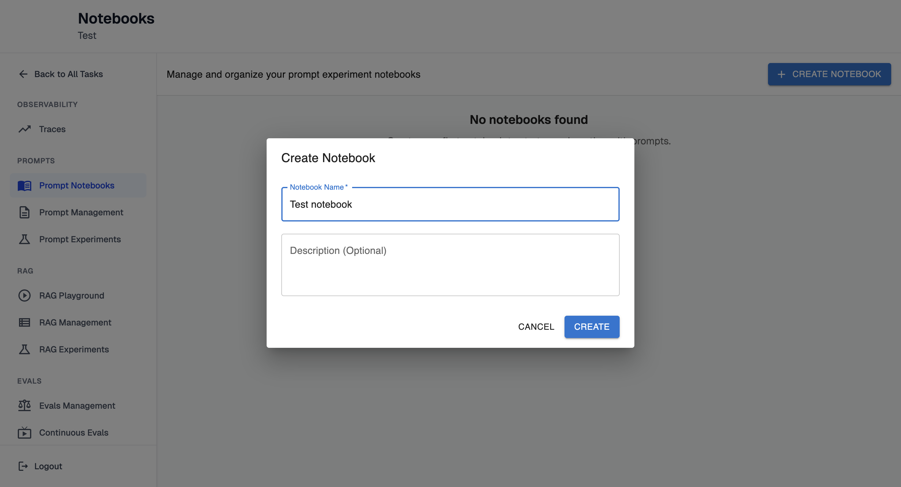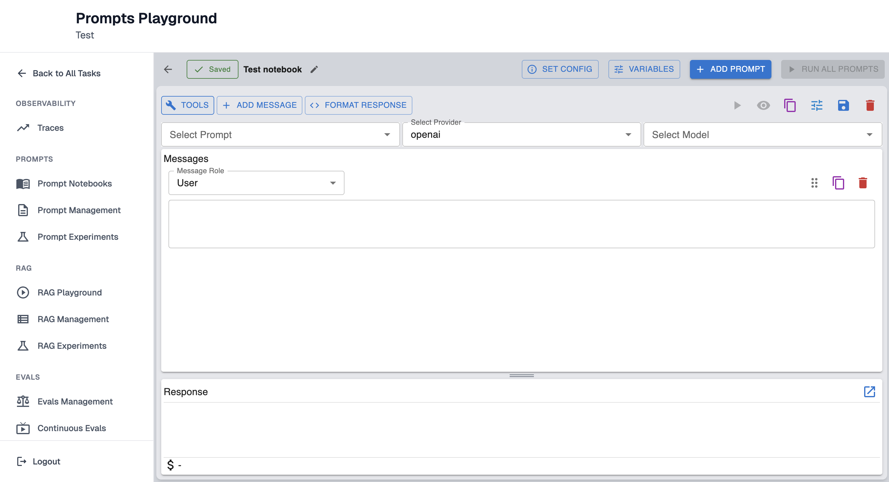 After creating new Notebook you will be redirected to Prompt Playground page where prompts can be created.