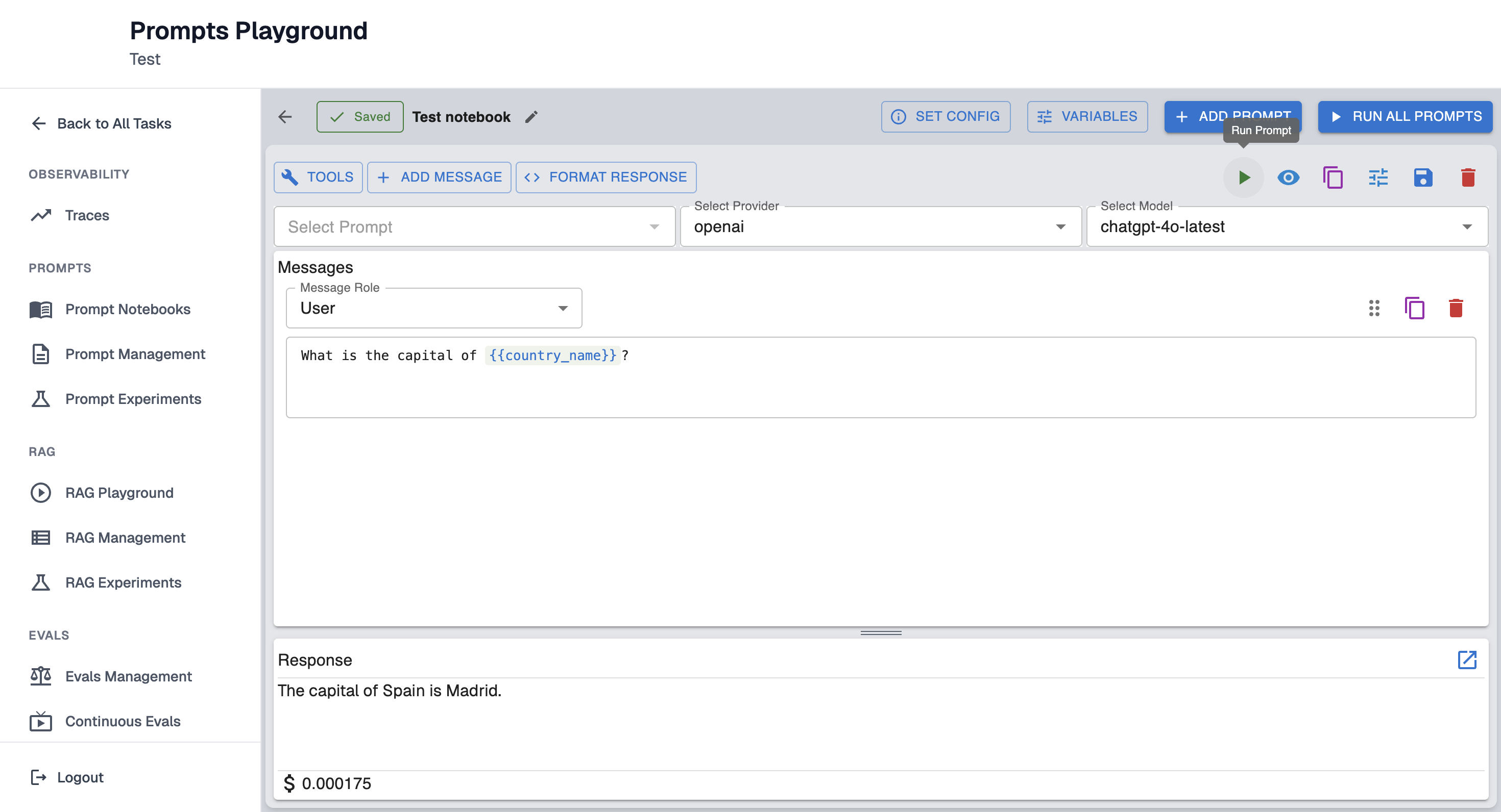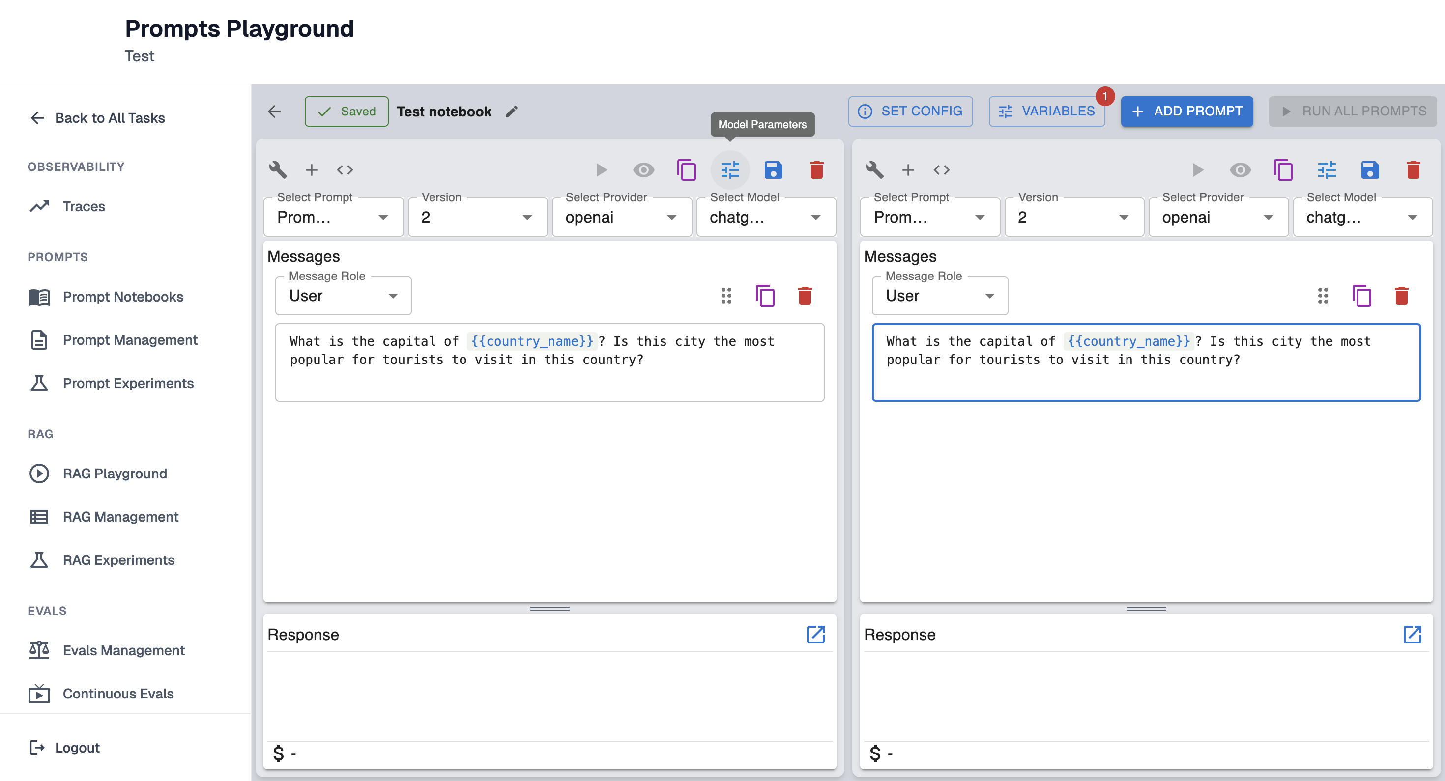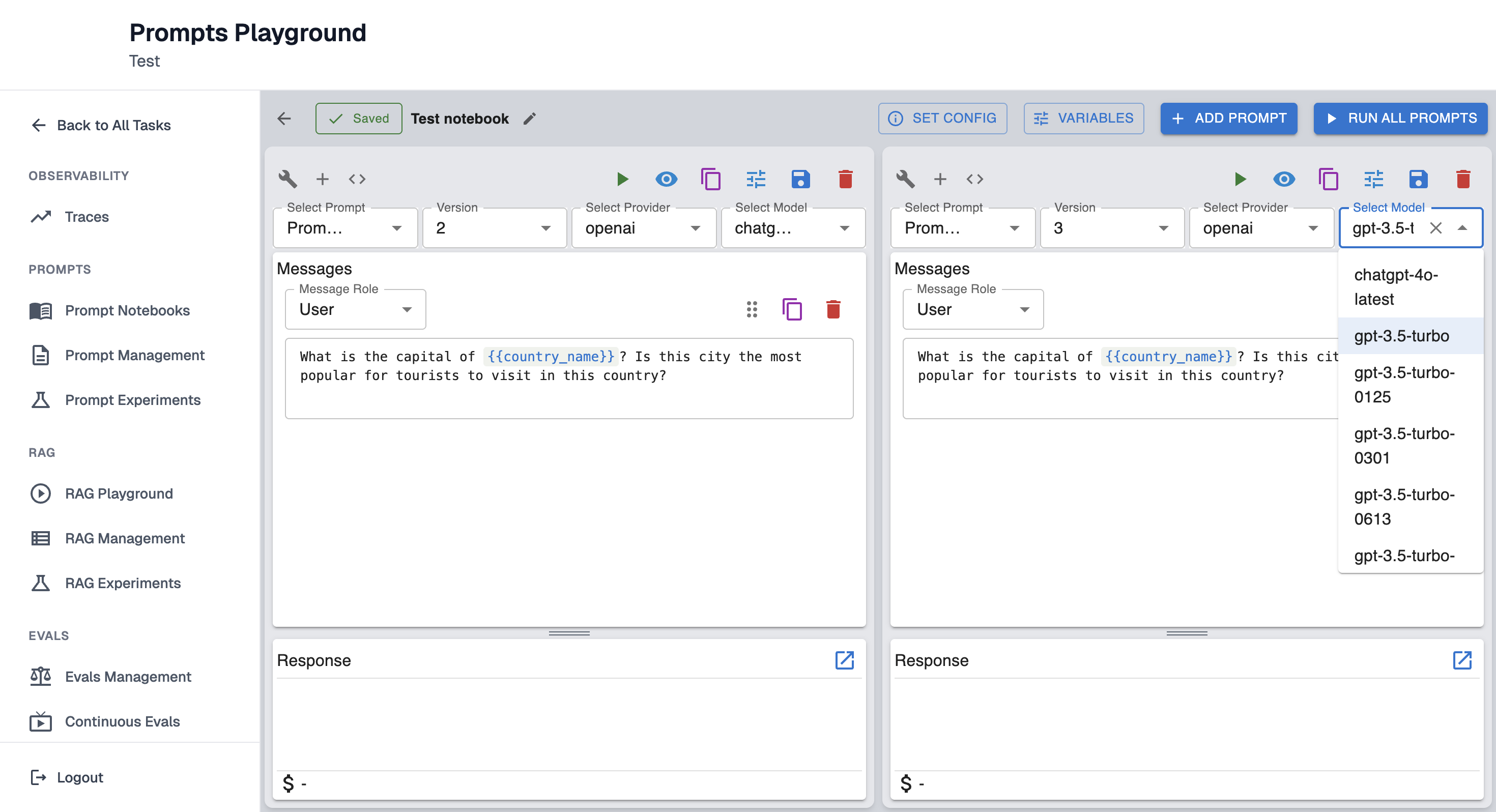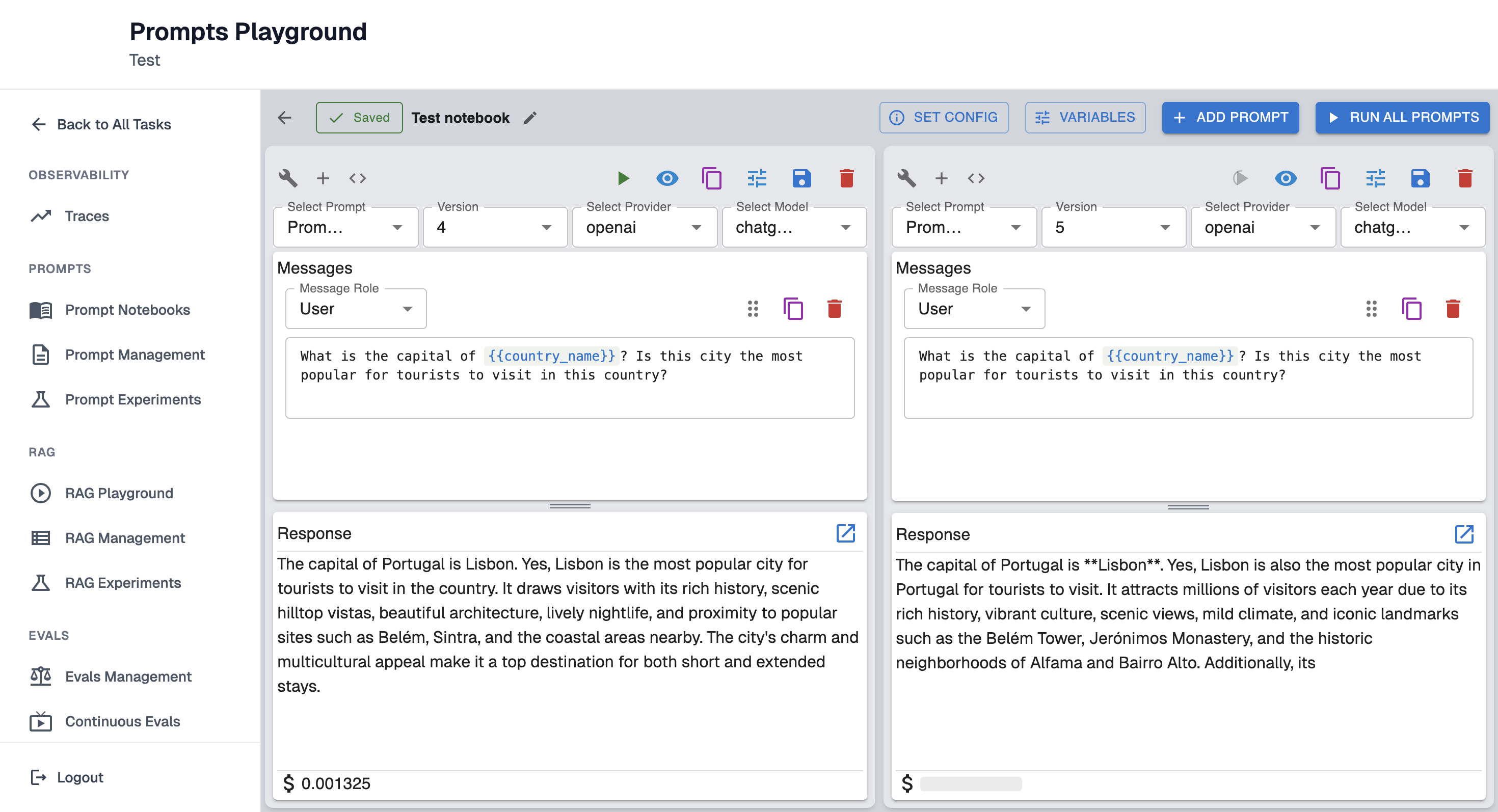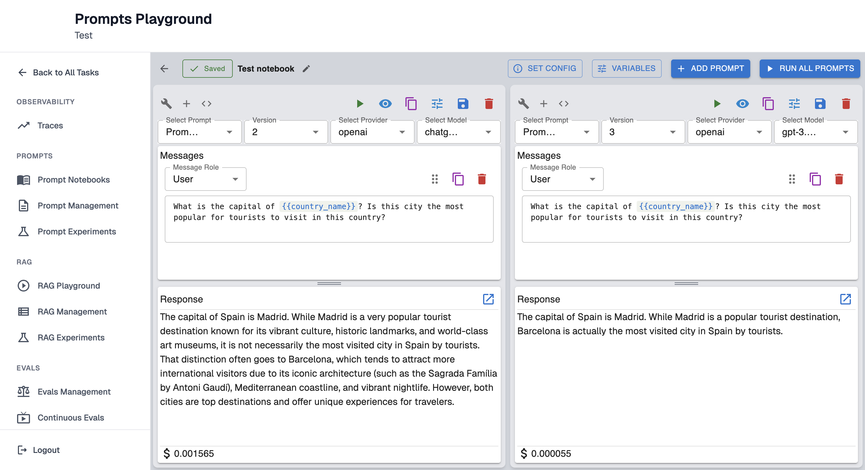 Prompt versions: the saved prompt versions you want to compare (you can overwrite existing notebook prompts with these, or keep your existing prompts and only load the config).
