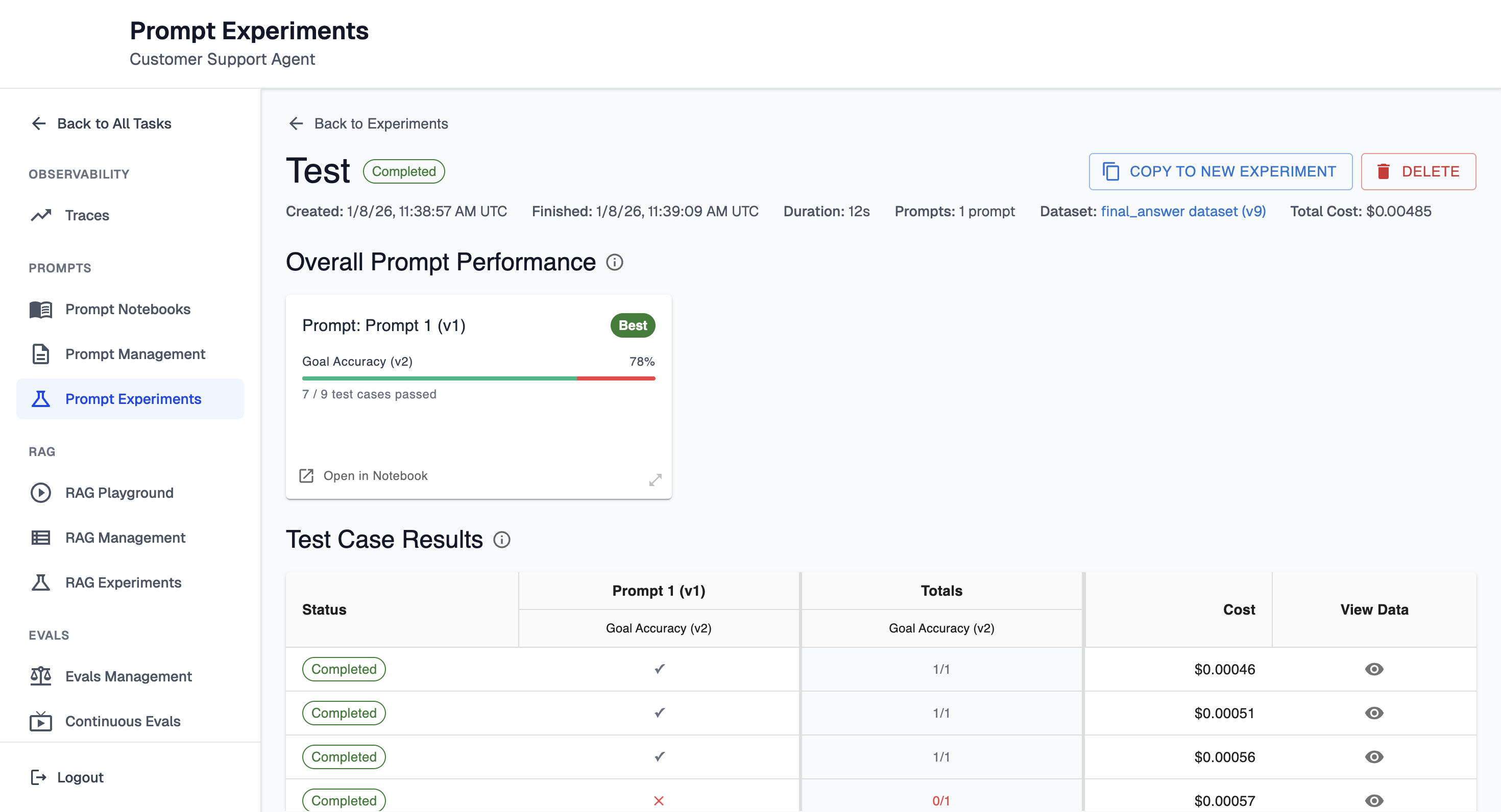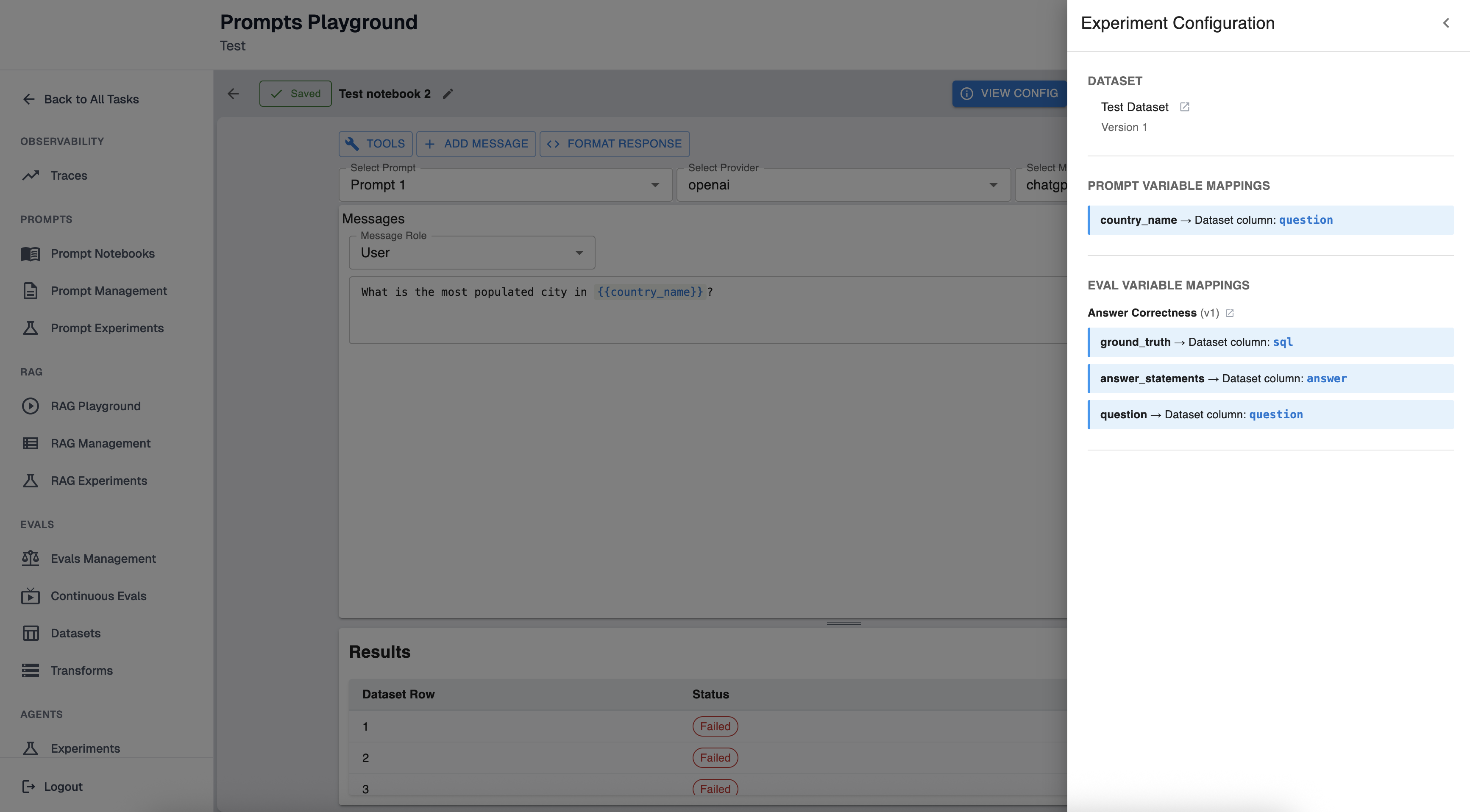 - Experiment Mode: dataset + evaluators are configured; “Run All Prompts” creates an experiment run across dataset rows and computes eval metrics.