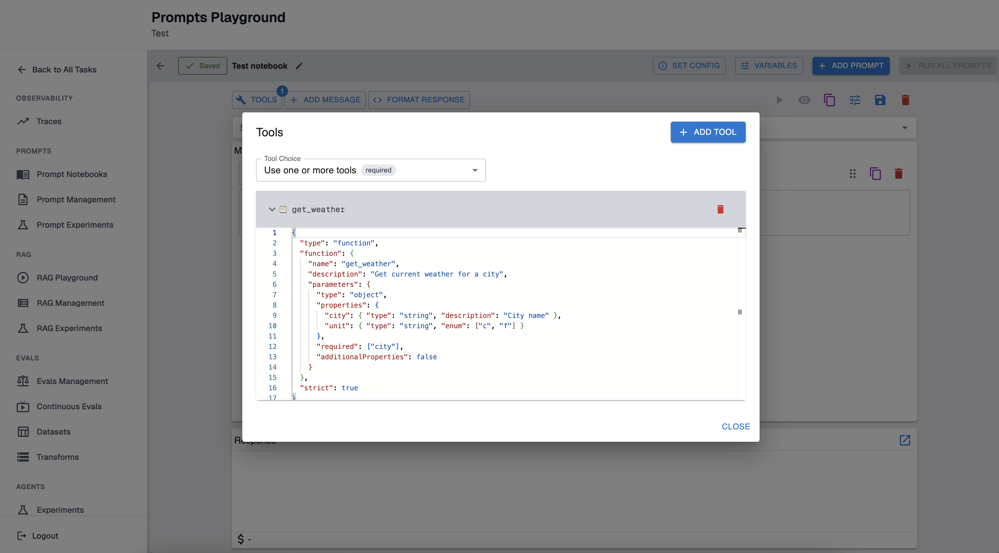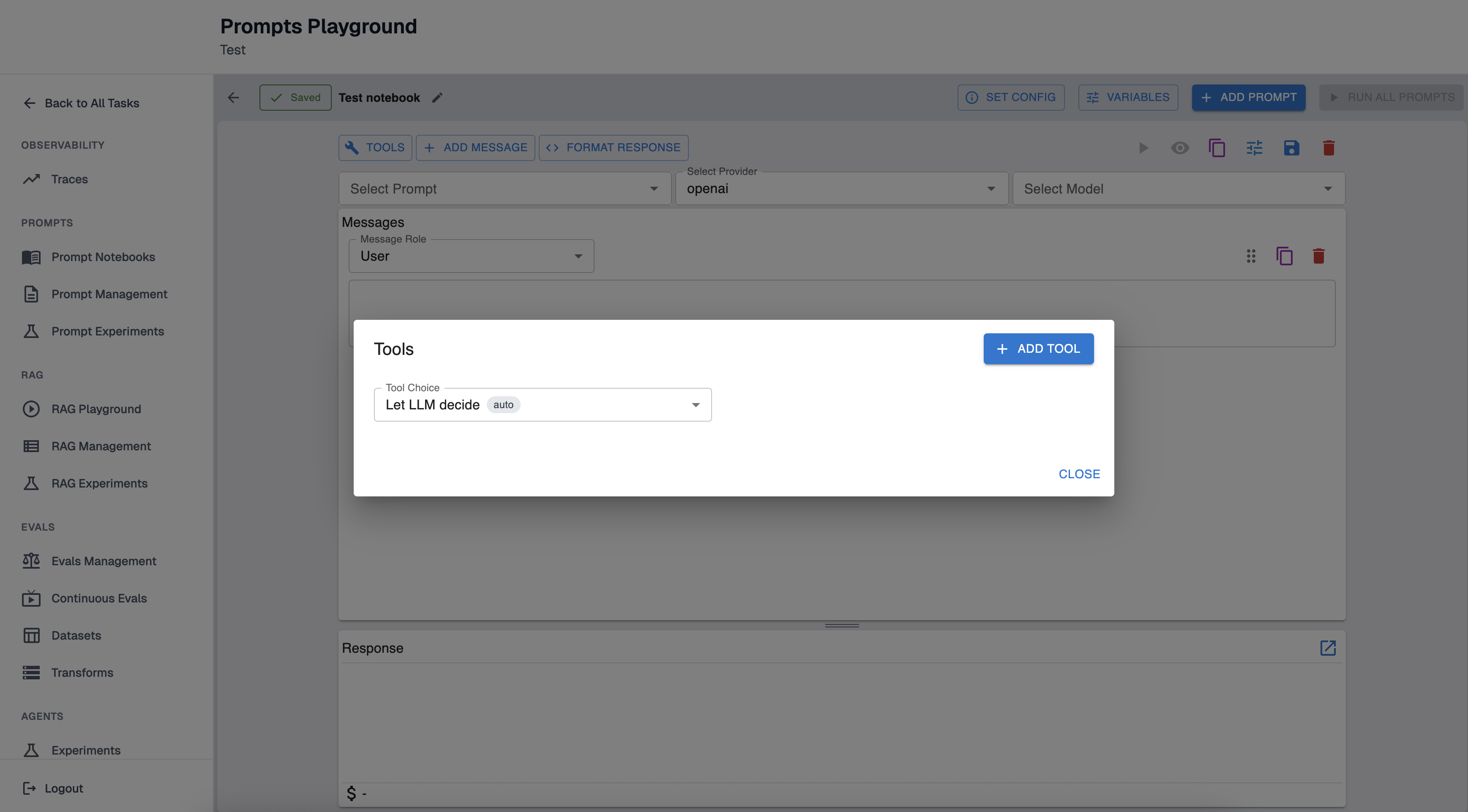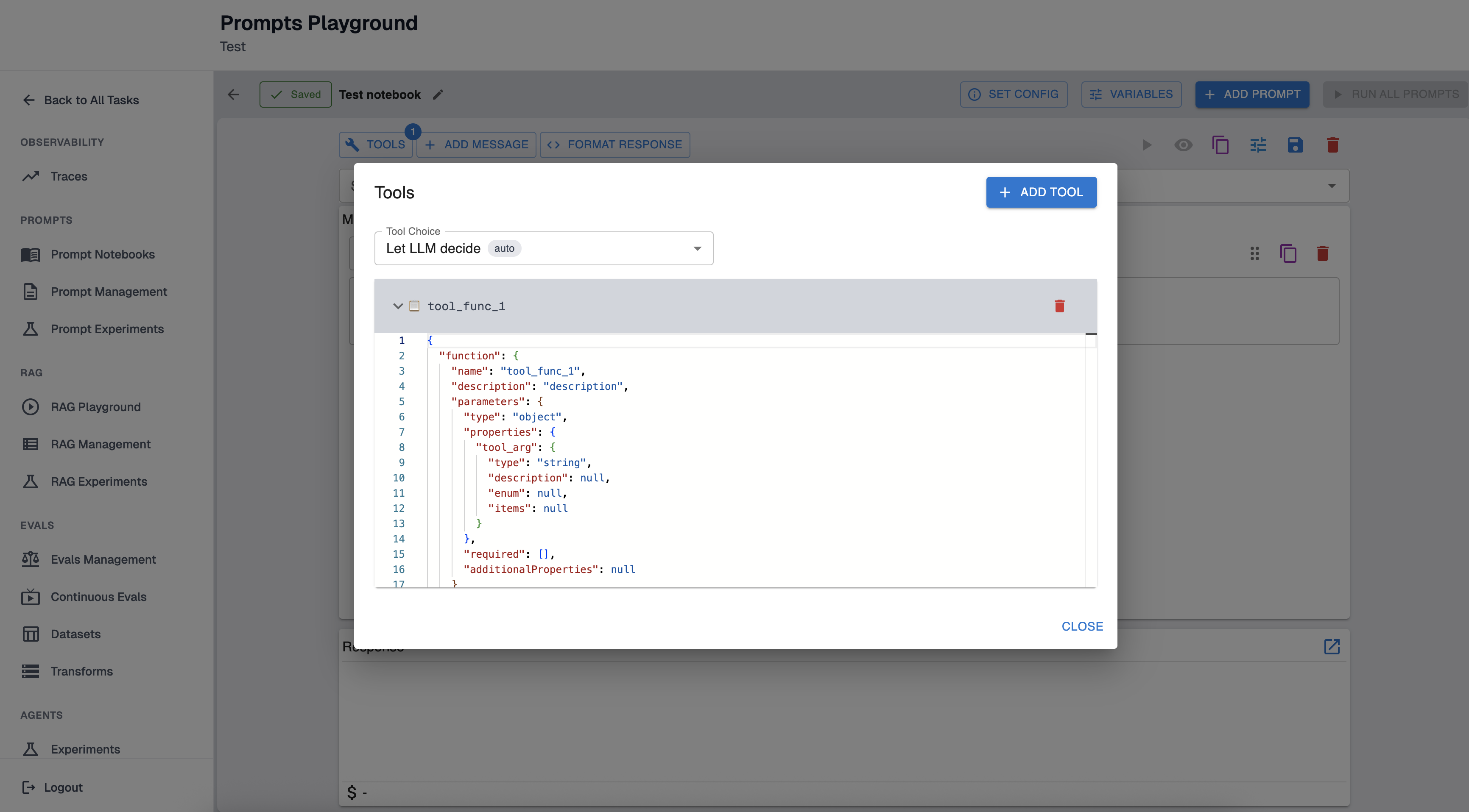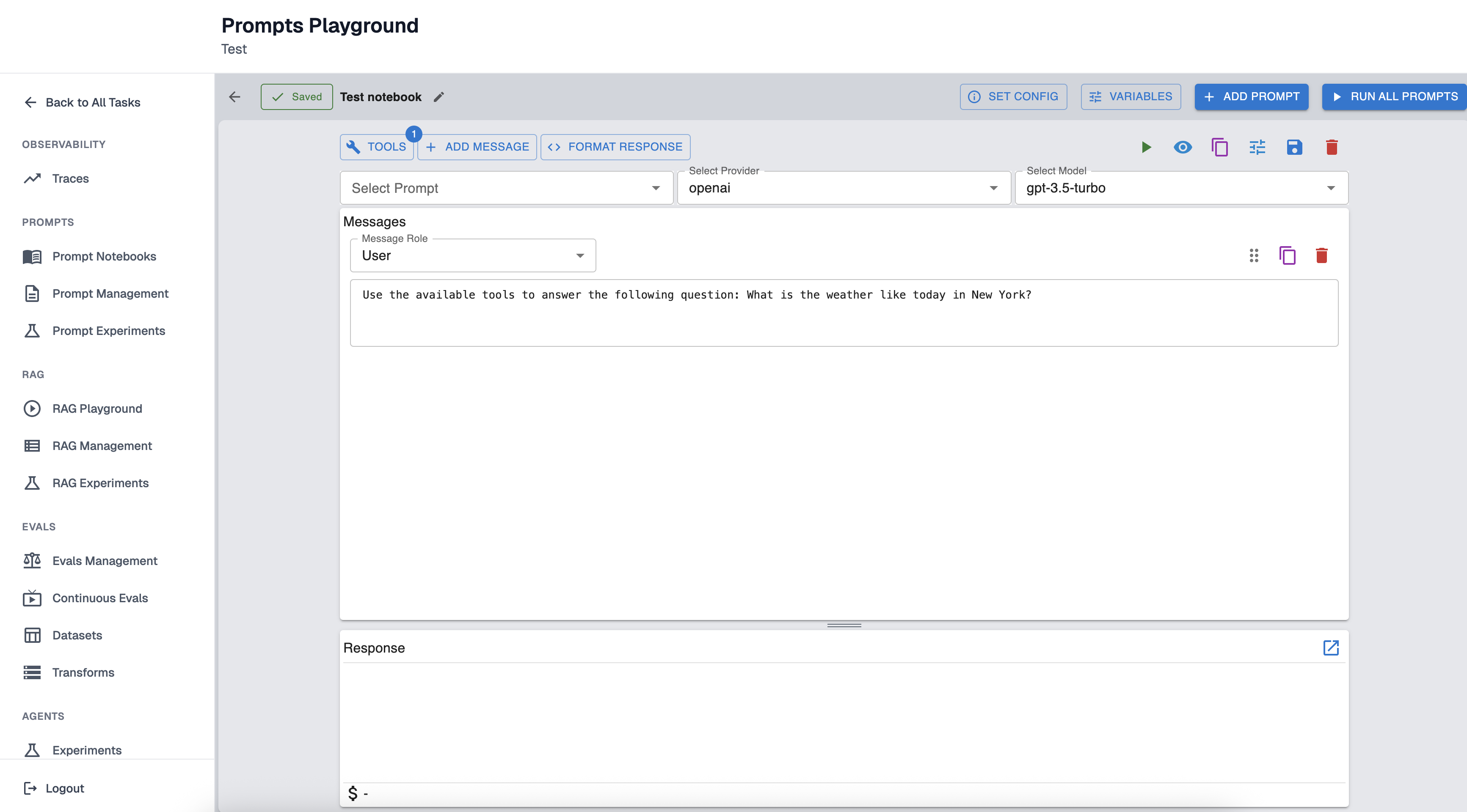 Important notes: Tools in Prompt Playground do not execute automatically. The Playground sends tool definitions to the model and shows any tool calls returned. Tool calls returned by the model will appear in the Response panel under “Tool Calls”.