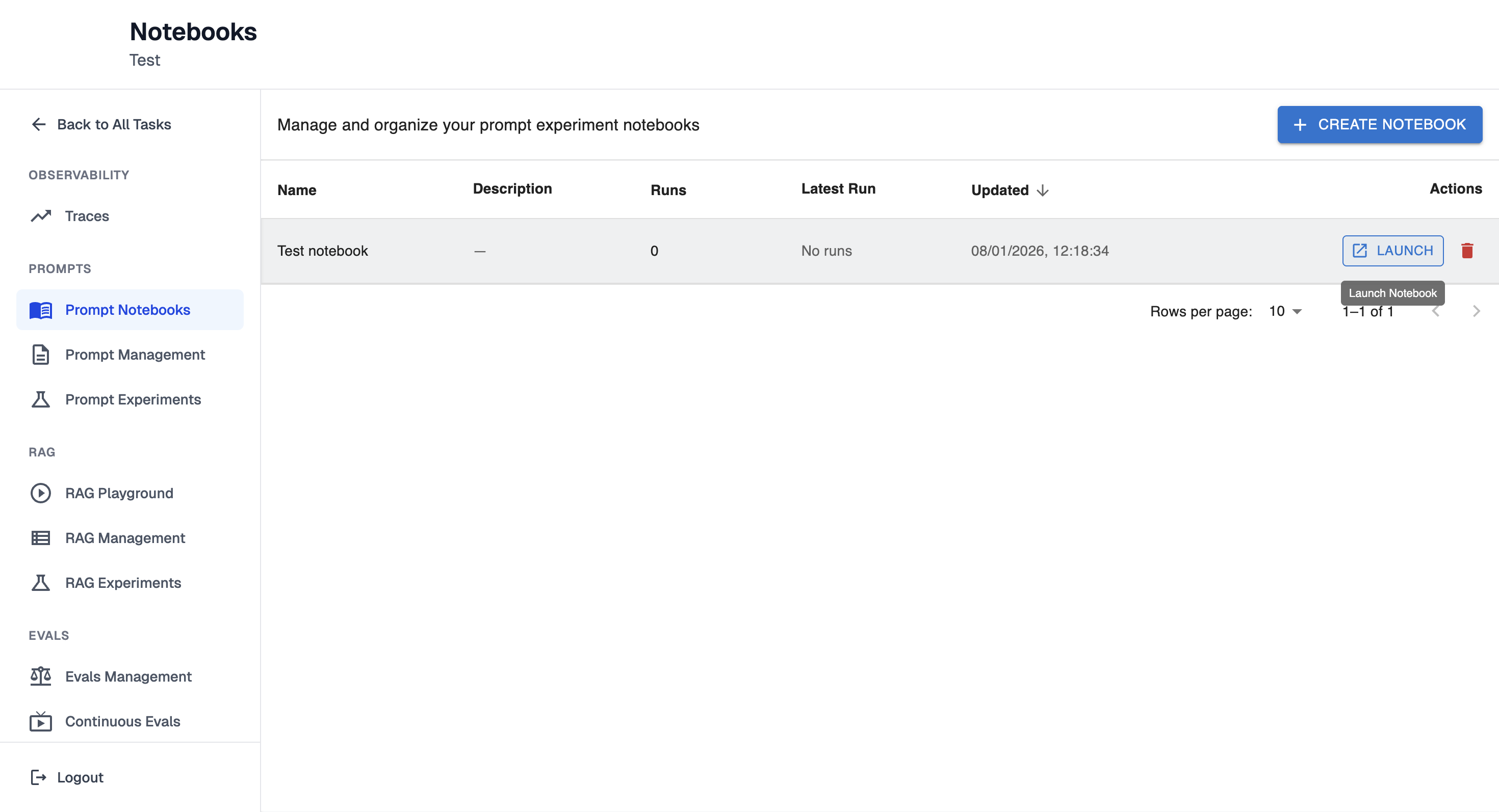 To navigate to Prompts Playground once Notebook is created navigate to Prompt Notebooks page and click on particular notebook "Launch" button.