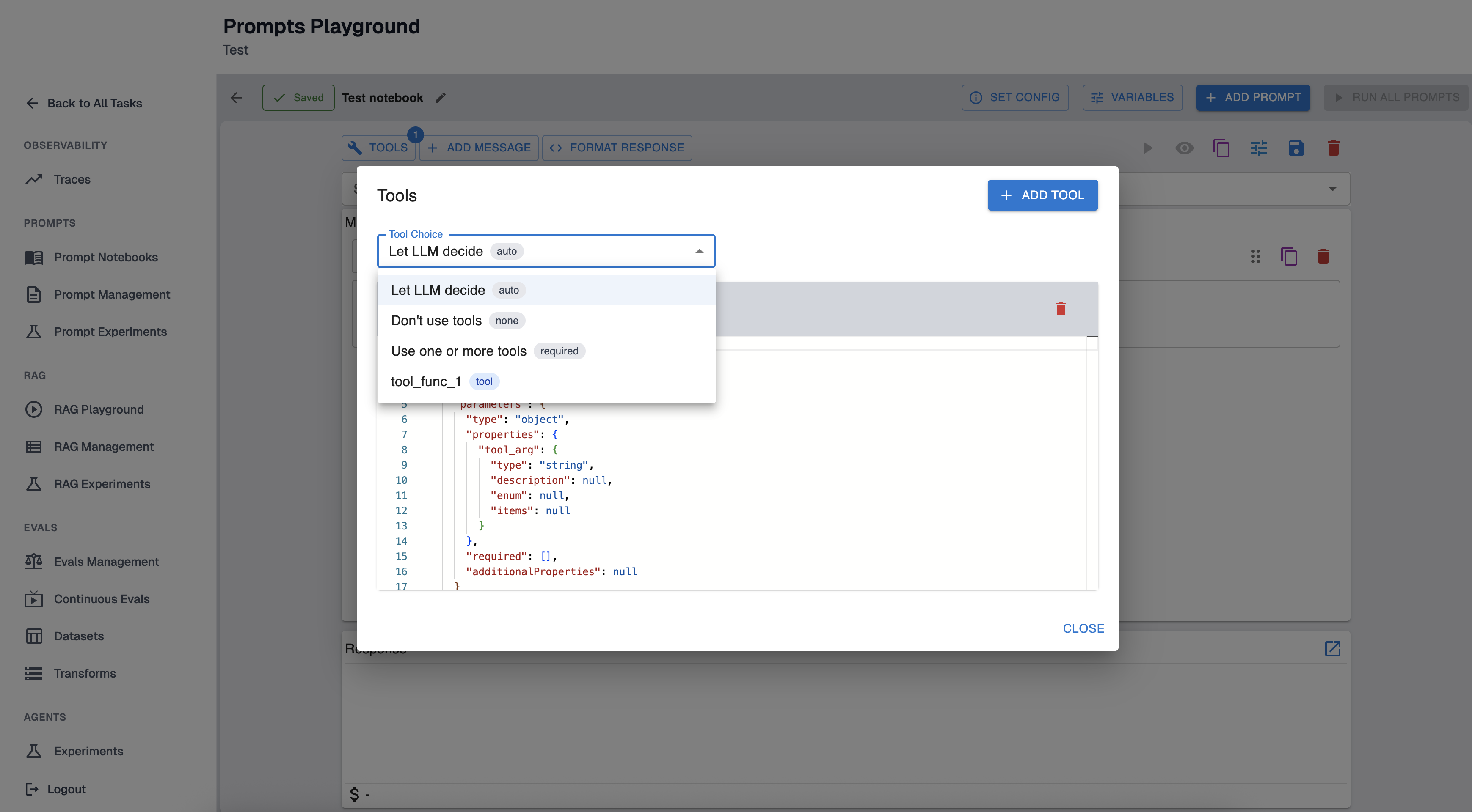 In the Tools dialog, set “Tool Choice” to control tool usage: