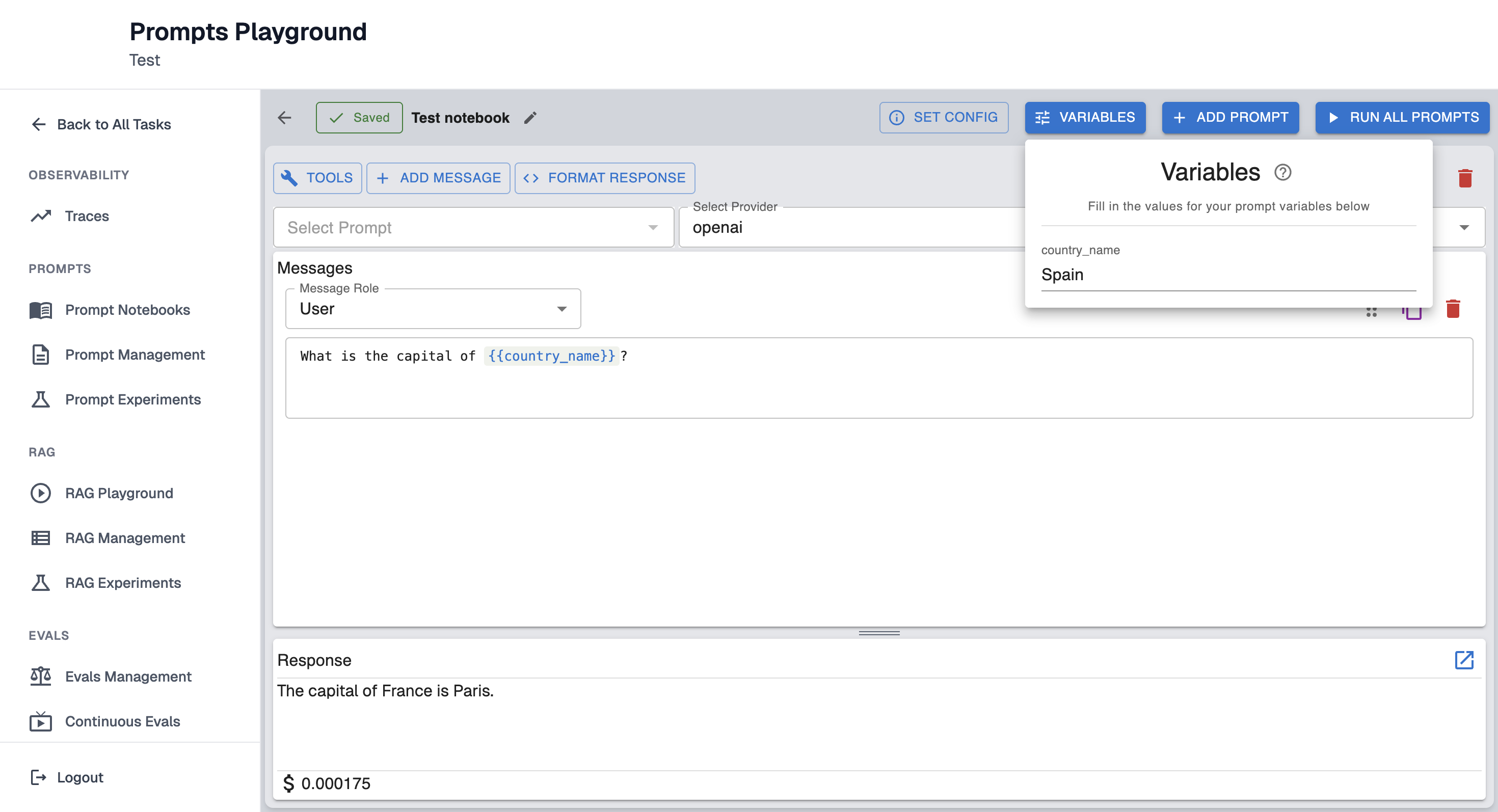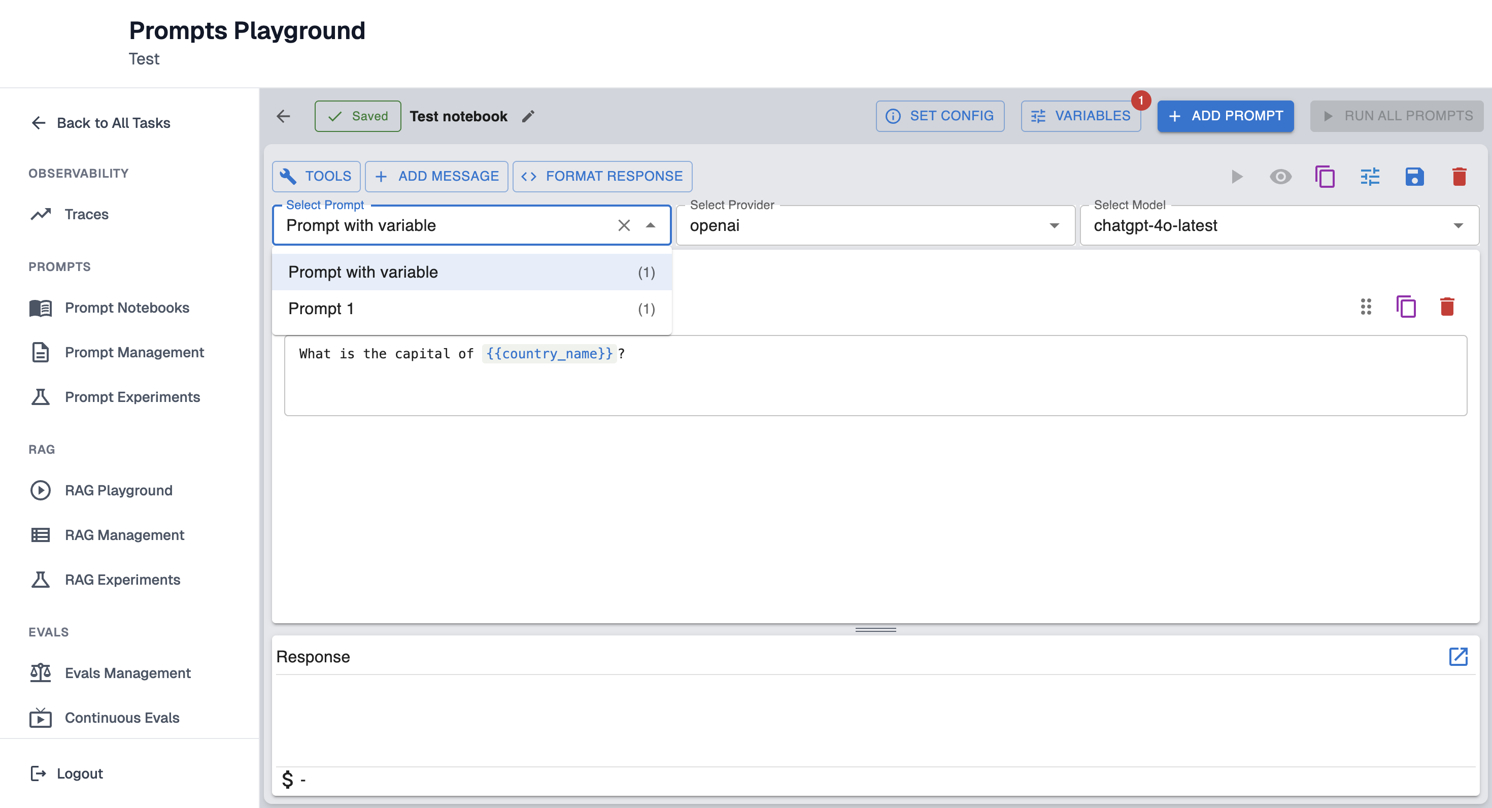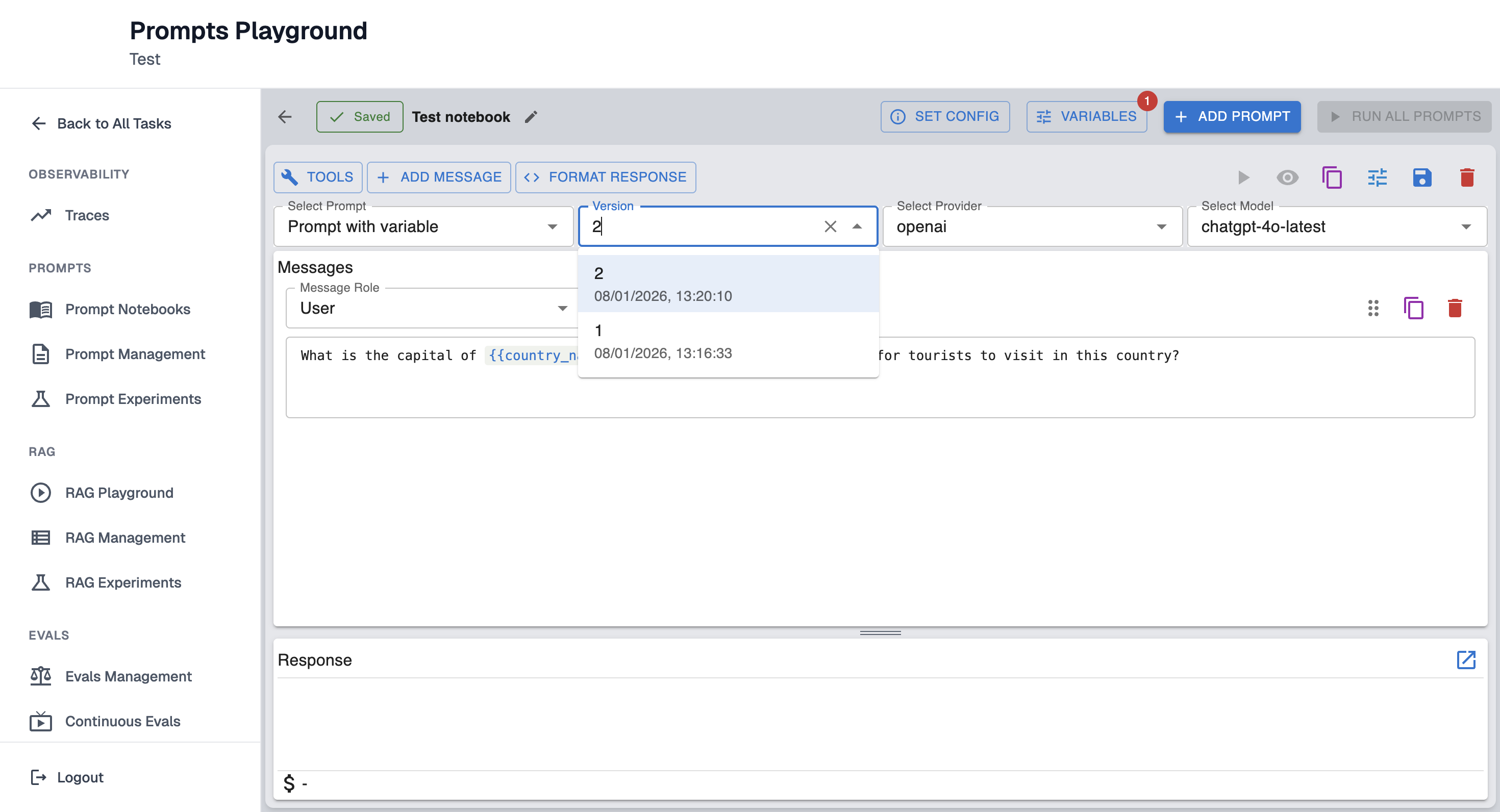 - If you have a saved prompt named "Prompt with variable" and edit it, then click "Save" without changing the name, it will remain as the same prompt ("Prompt with variable") but will increment to version 2.