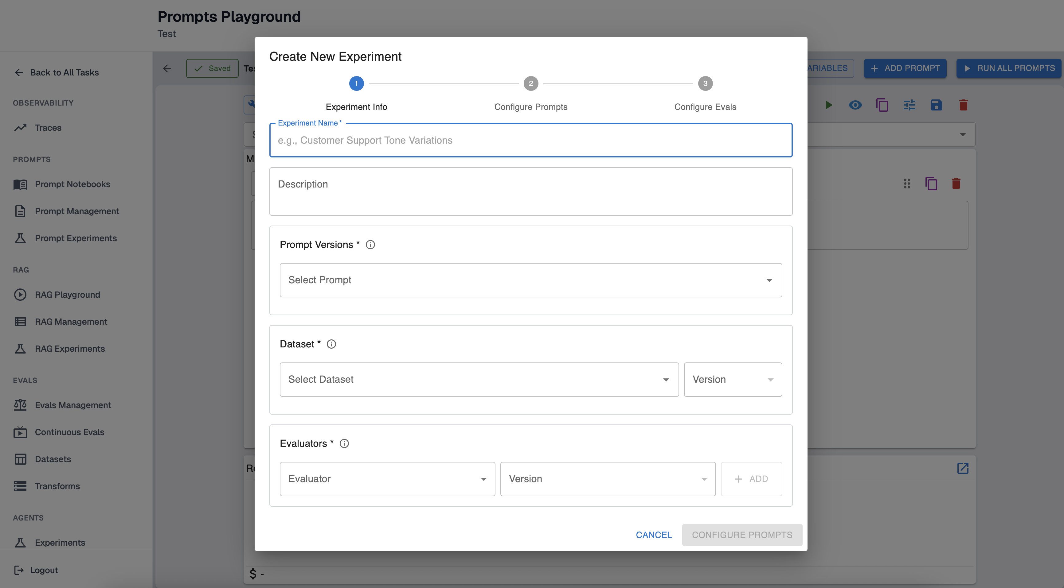 - Load an existing experiment configuration (to reuse dataset/evals/mappings).
