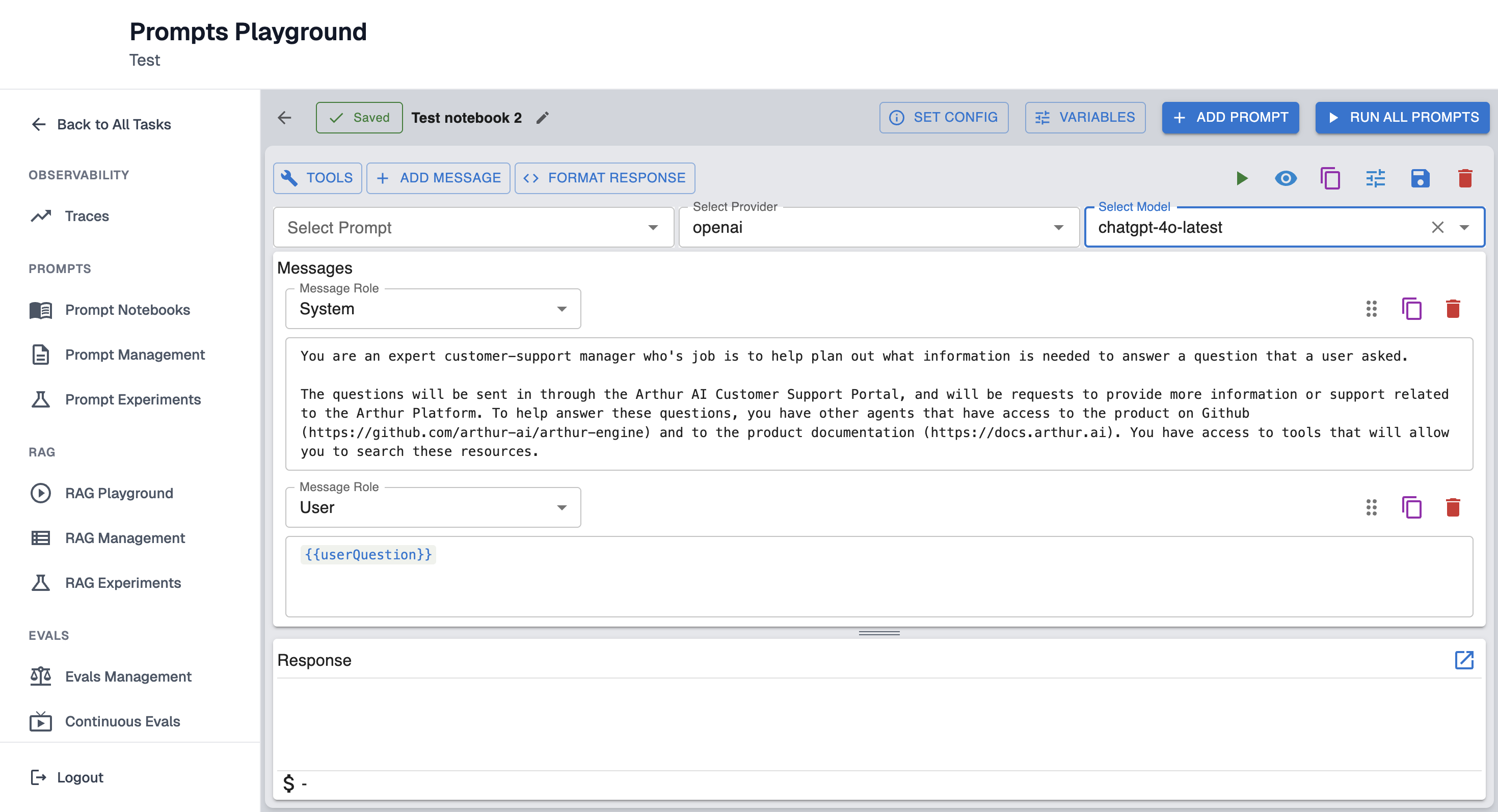 Quick testing can be performed without creating a saved prompt. Ad-hoc prompts can be defined directly in the Prompt Playground. To do this, follow the steps below.