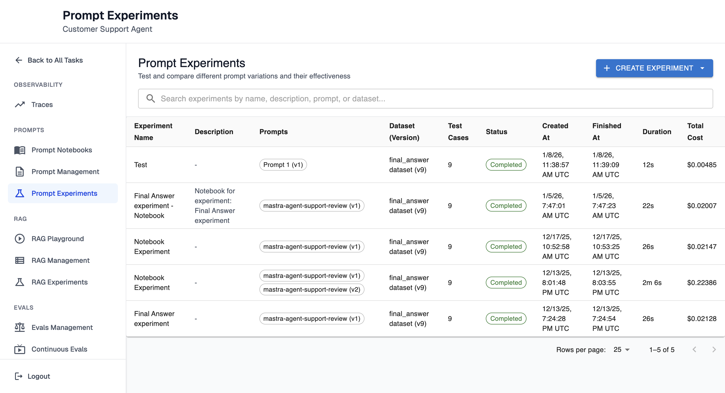 You can also start from a completed experiment. To do that navigate to Prompt Experiments and open an experiment detail page.