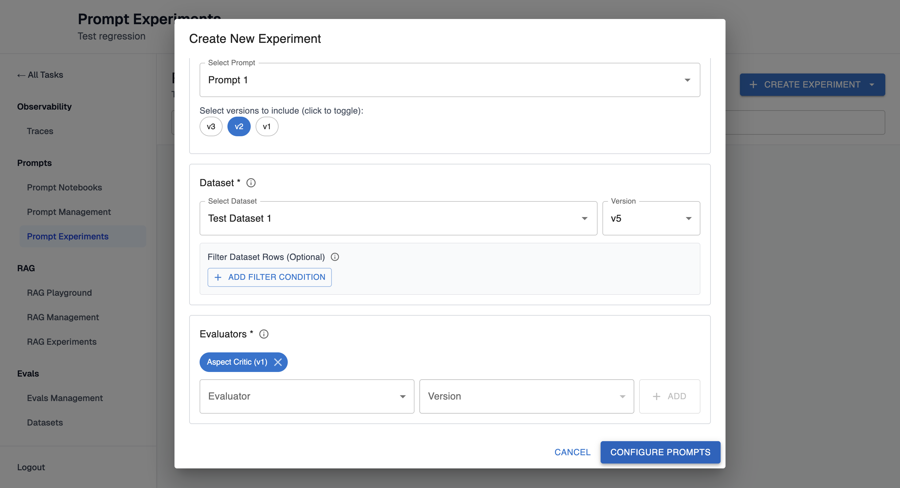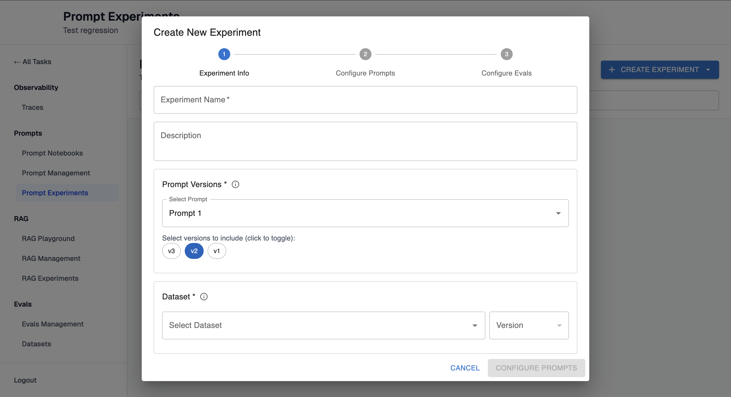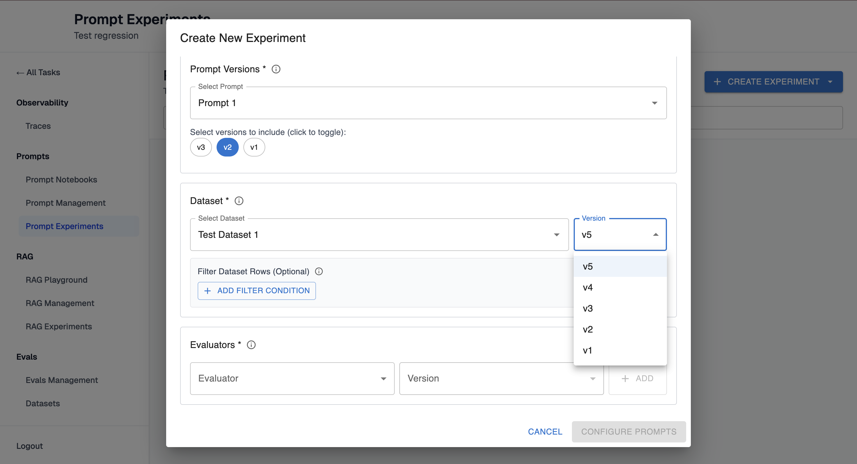 Select one or more versions of that prompt to test (e.g., Prompt 1 v1, Prompt 1 v2, Prompt 1 v3)