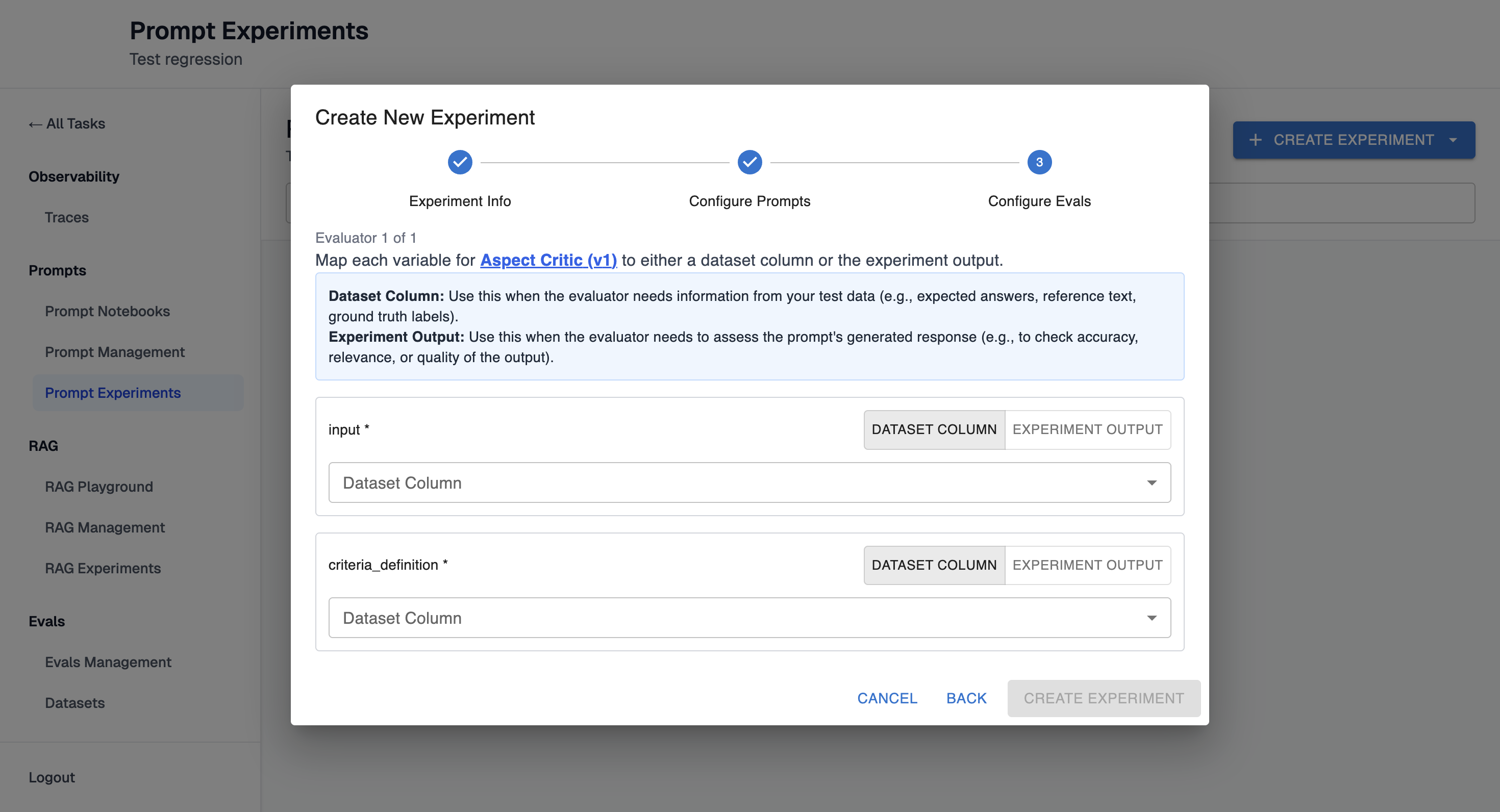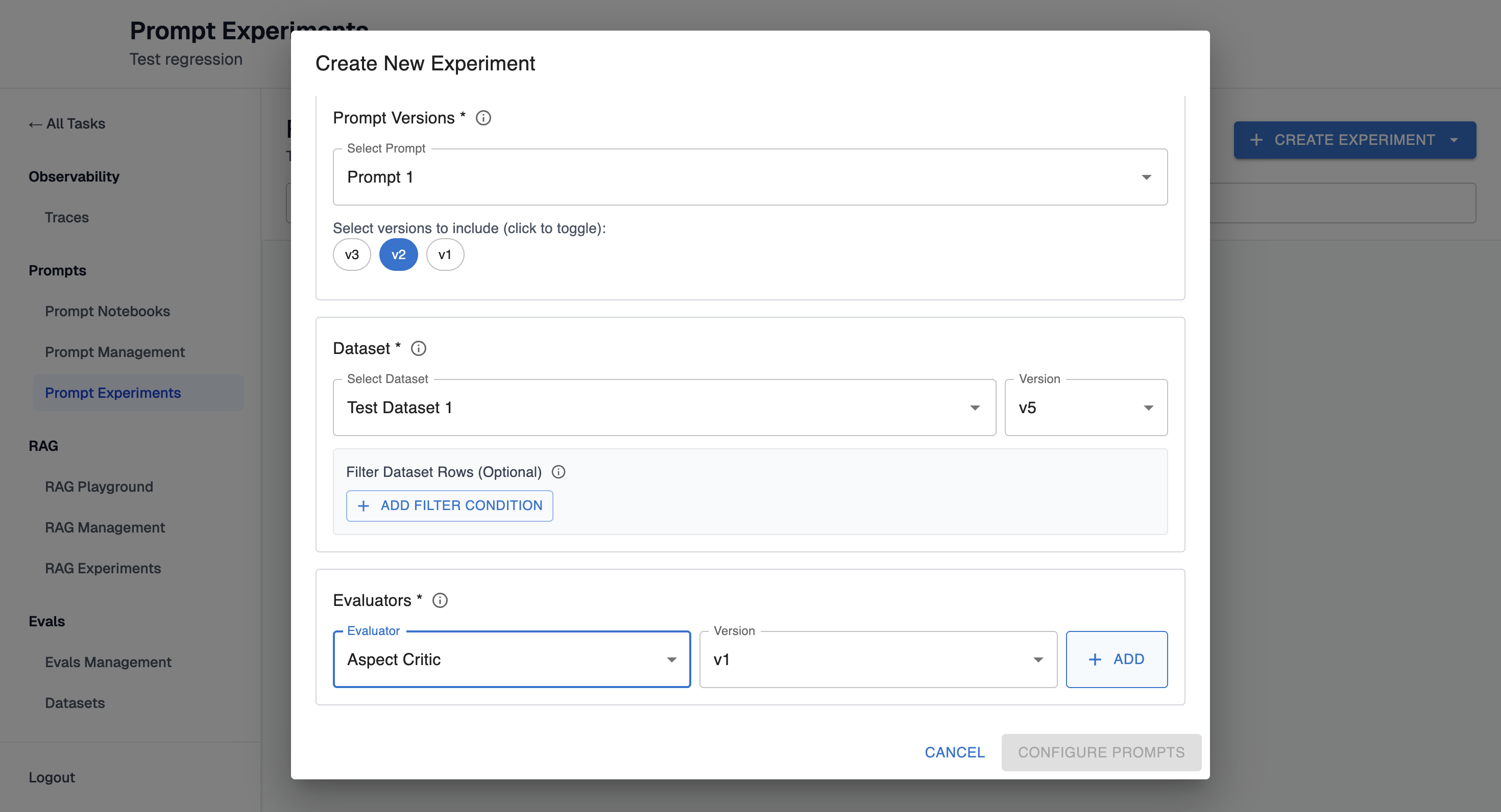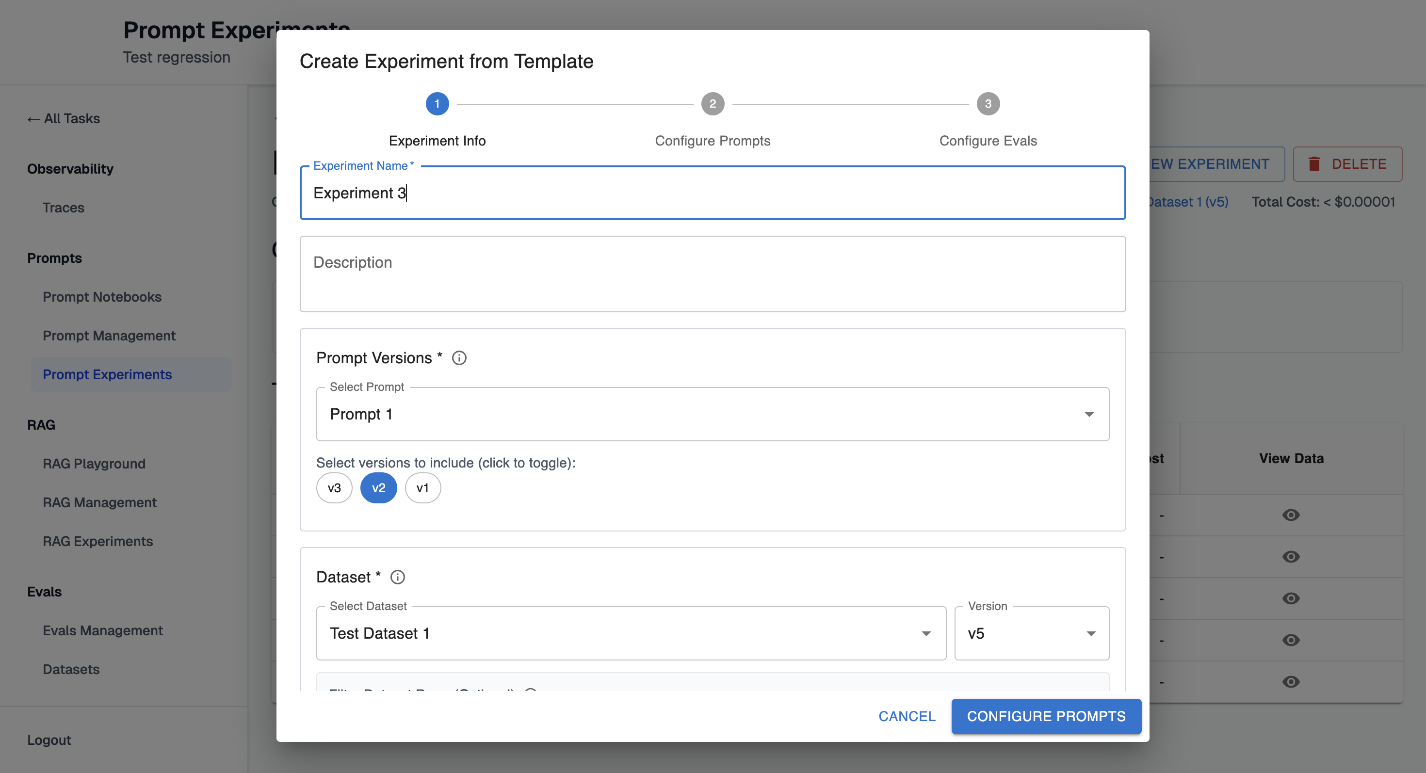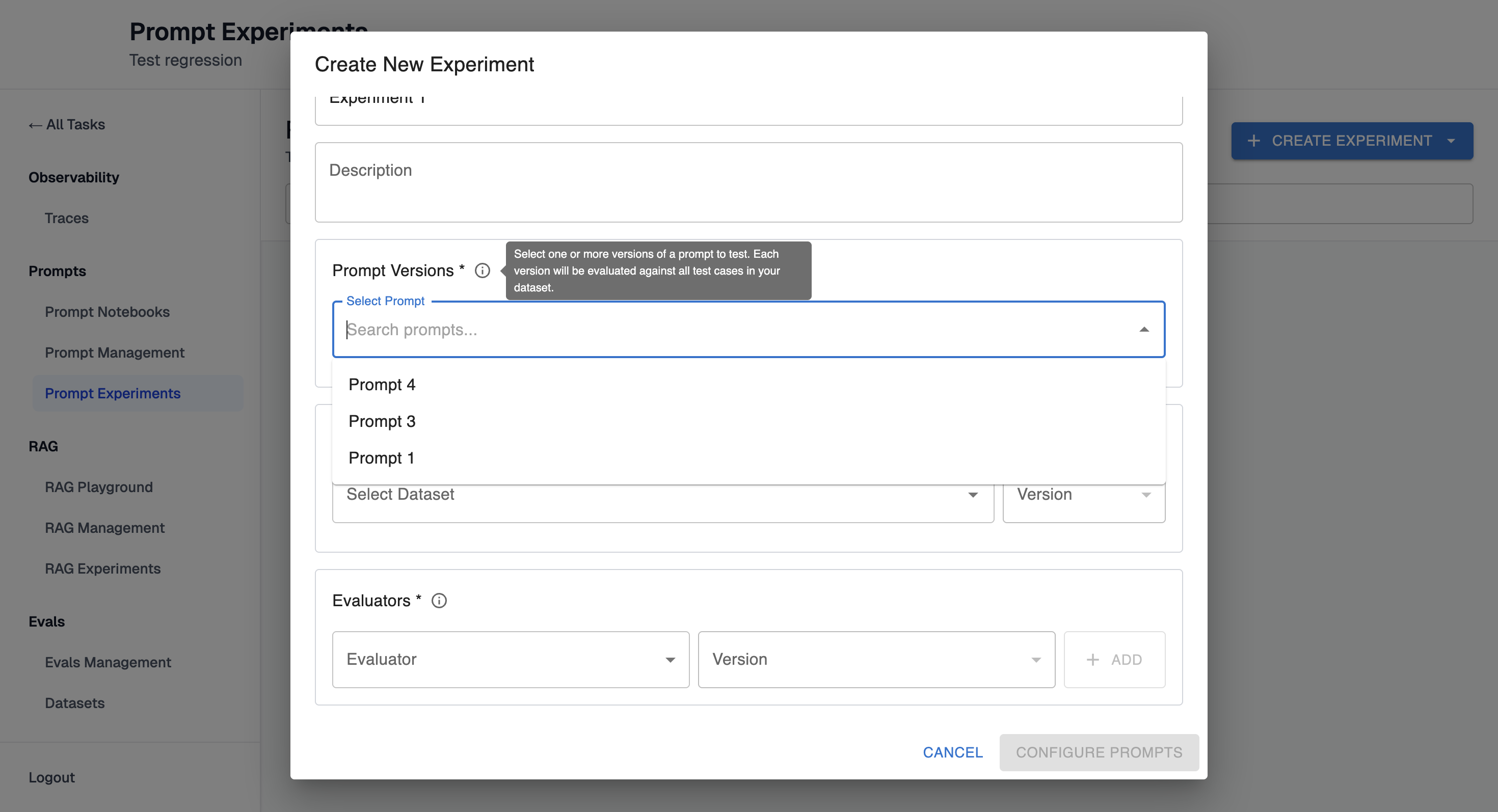 Select one or more versions of that prompt to test (e.g., Prompt 1 v1, Prompt 1 v2, Prompt 1 v3)