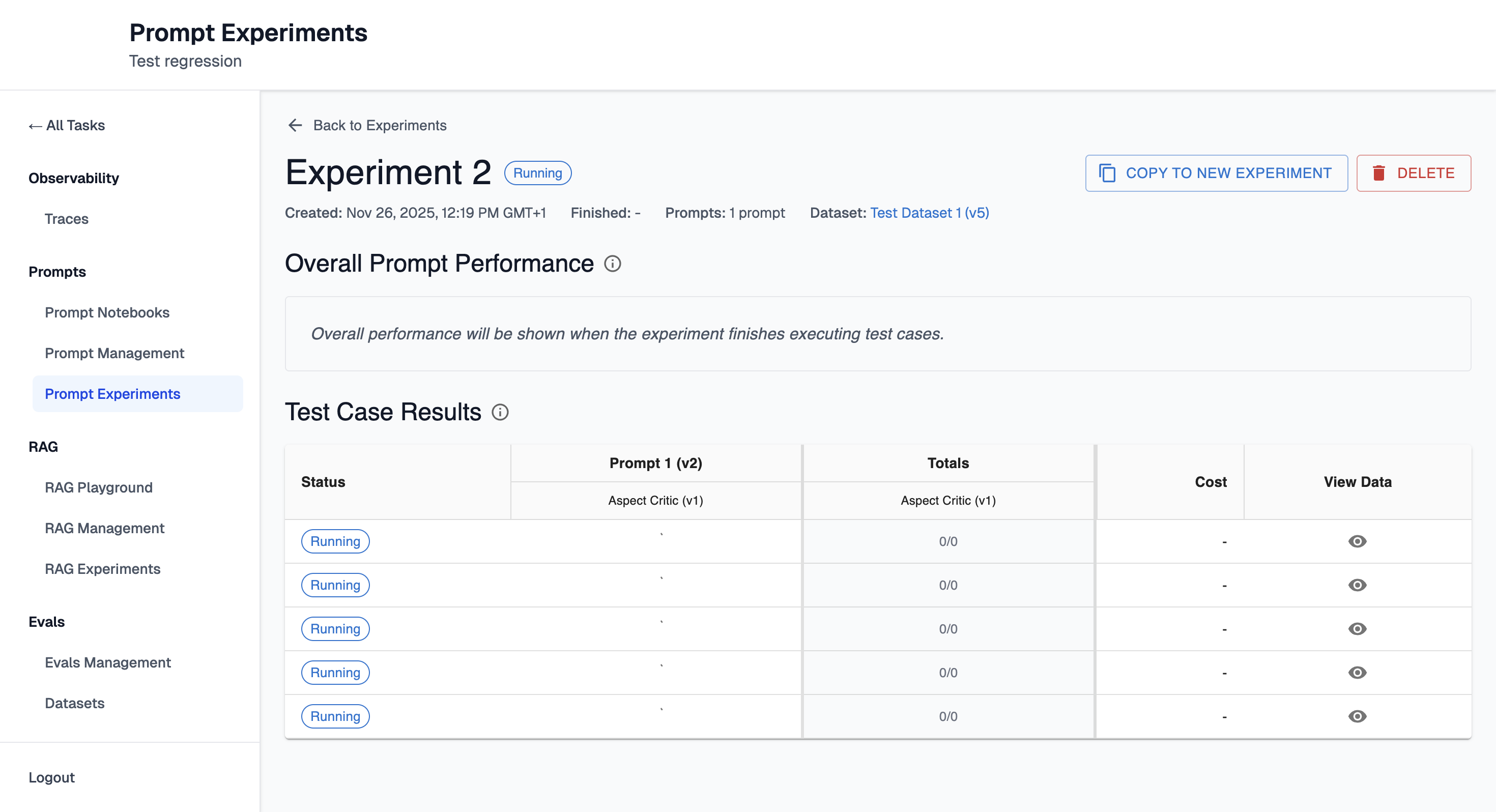 The experiment runs asynchronously - results will populate automatically, and you can navigate away and return later