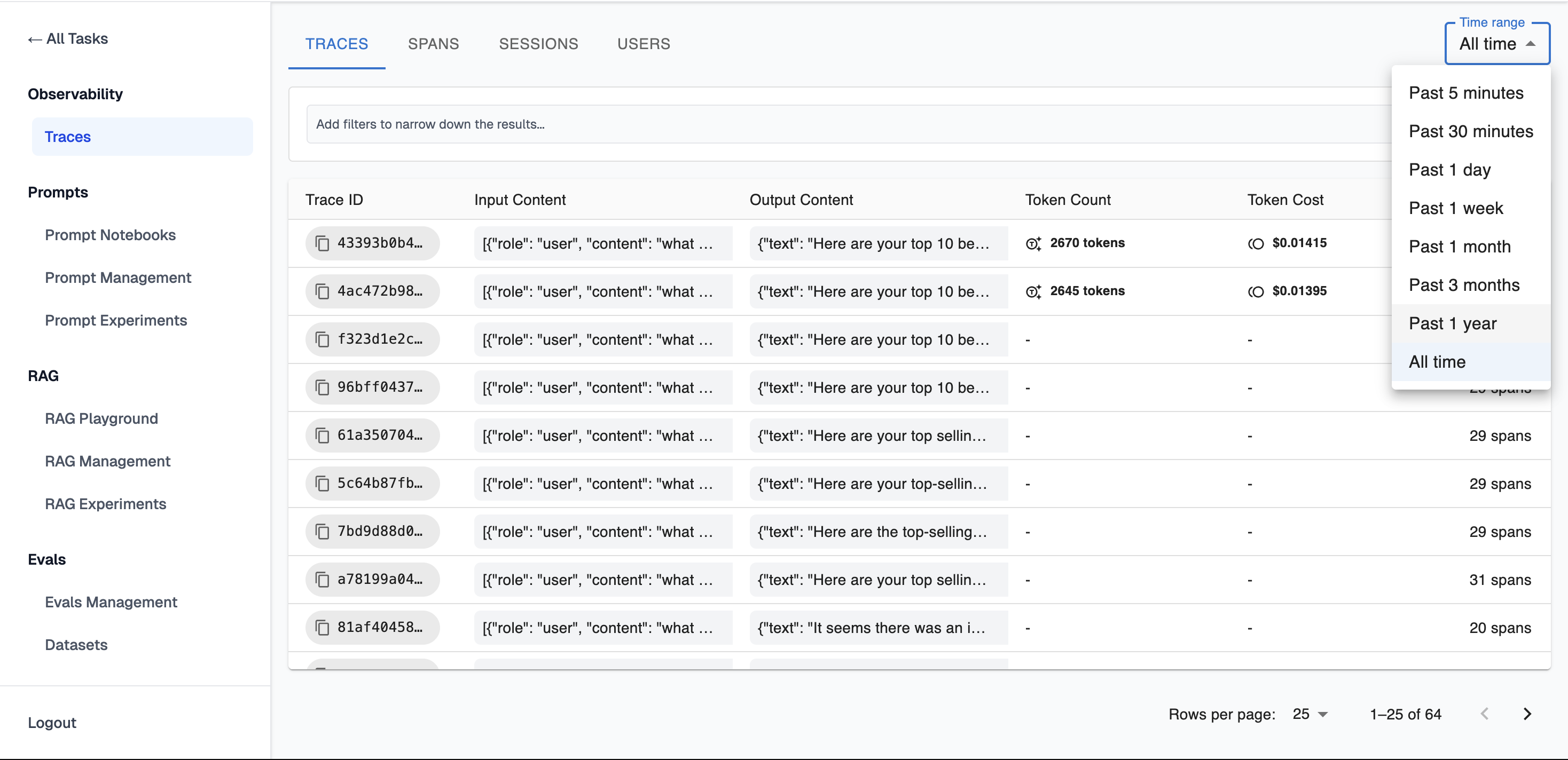 It's possible to filter traces by selecting time in which they occurred: